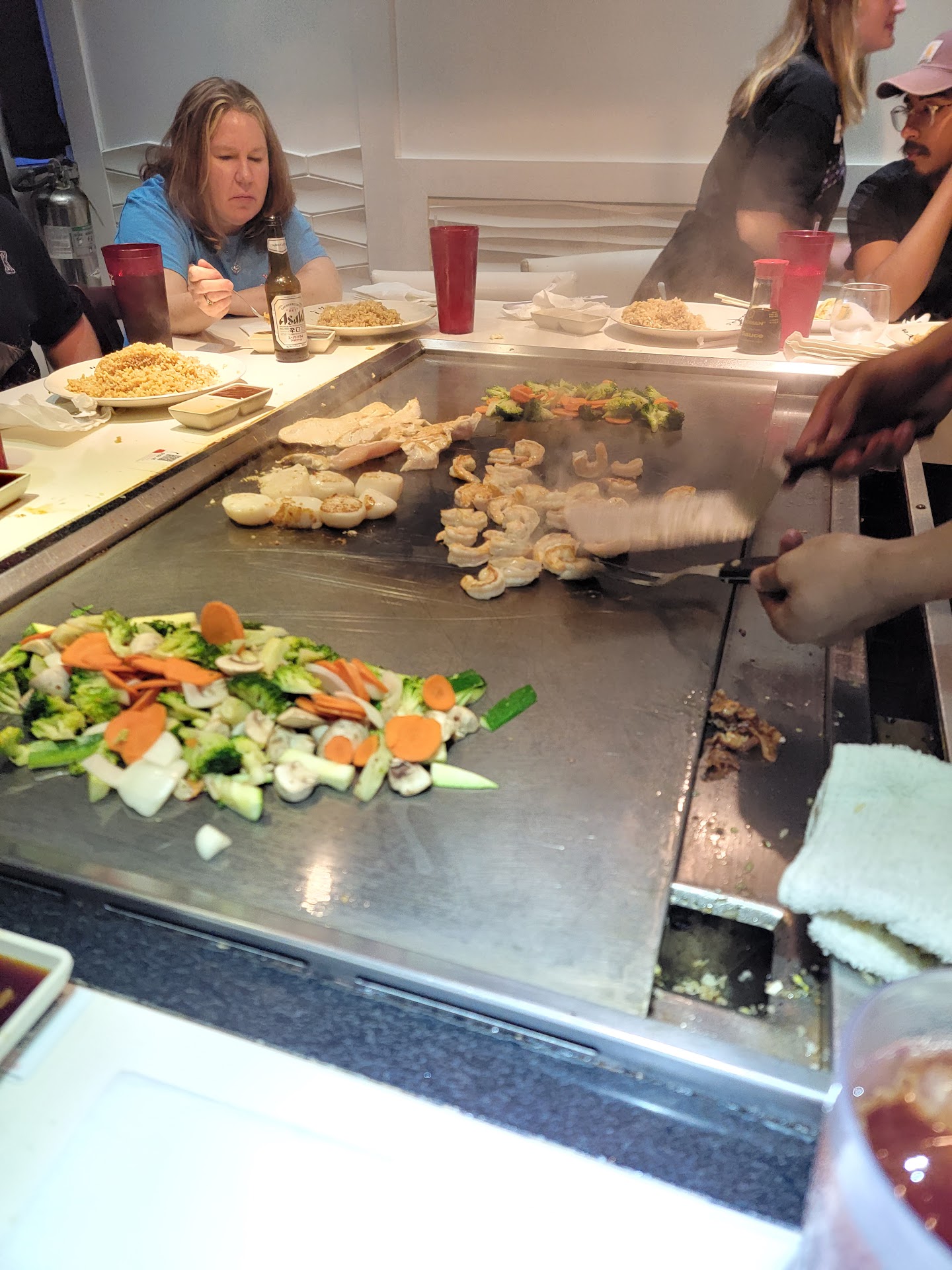 Read moreI regular this location a lot and out of the 100000 times visiting I am extremely disappointed with my visit tonight. I arrived and was sat with my party of 5 @ 8:00. Waiter came out pretty fast asked what we needed as far as drinks. Drinks were brung over and we waited for soup and salads. Another party was sat at our table and they have about 9 people with them. I am always happy to sit with another party during hibachi but based on the party size you would think they would sit them at there own table because this would bring our table to 14 guests. Waiter brought soup and salad and assisted the party that sat with us. Upon ordering the opposite party split 4 plates of hibachi between 9 people which affected the amount of food we received as we were supposed to receive extra rice because two people in our party agreed to no vegetables. This was offered to us by the waiter. The chef came out around 8:45 and seemed irritated as well because the party size was extremely large and the orders didn’t make sense that was written because of the sharing of the plates. My sister and daughter never received double rice because there was not enough food on his cart and to save time we agree to just move forward. I requested to order drinks once our waiter got the dirty plates but he never returned and pretty much just popped in once i retreated to get a manager. The sharing of plates , party size , waiter all attributed to time wasted and food not ate at the table because we spent over a hour waiting for all of our stuff to get cooked.