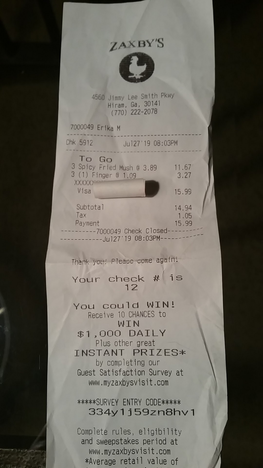 Read moreI am a witness. ...and My wife is writing this review. .. I (Mrs. Smith) went to your location on Jimmy Lee Smith Pkwy in Hiram Ga. And the young lady at the register kept touching a broom handle and sweeping the wet floor in the food preparation area and when a customer came up to order she NEVER washed her Nasty hands..... she did this repeatedly. She kept opening up customers orders and put her nasty hands on and near their food having NEVER WASHED HER HANDS!!!! The sink where she could CLEARLY WASH HER HANDS WAS NEVER OVER 6FT FROM HER AND SHE NEVER WASHED HER HAND. At one point another employee came up that was attending to the dining area and asked her to wet the cloth she was using to wipe the tables and the trays down and the young lady behind the counter took the cloth and dipped it in a MOP BUCKET which had dirty water in it and gave it back to her and she the wiped the tables and trays down with that NASTY cloth. Once the young lady had done this and dipped her hand in this dirty water to wet this cloth for the other employee, I said..... ok SURELY SHE WILL WASH HER HANDS NOW!!....... AND YOU KNOW WHAT???....SHE STILL DIDN'T!!!! WOWWW!!! She went right back to handing customers orders and seemed very UNCONCERNED about any of it. I DEFINITELY WILL NOT EAT HERE AGAIN AND I WILL BE CALLING CORPORATE ABOUT THIS ISSUE. IT'S NO SHOCK THAT YOUR HEALTH SCORE WAS 88..... IT SHOULD BE LOWER THAN THAT. I Paid too much money for my meal and I was very unhappy. The only reason I took my meal was because I don't believe in causing a scene and putting others on BLAST IN PUBLIC Places because I wasn't raised that way. My next review is with the BBB. This written by Ms.Smith . Public Be Warned..... See photo of my receipt Corporate Viewers under your photo section, it has the employees...