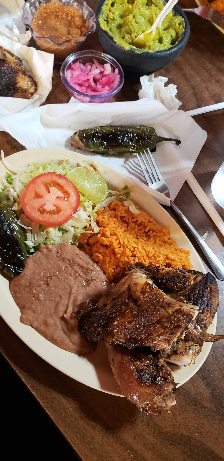 I got a Half Chicken for $12.99 (as of this writing) and it came with hot Tortillas, Half a chicken, salsa, pickled red onions, beans, rice, lime wedge, grilled jalapeño, lettuce, and tomato. Next time I am in town this is where I am...