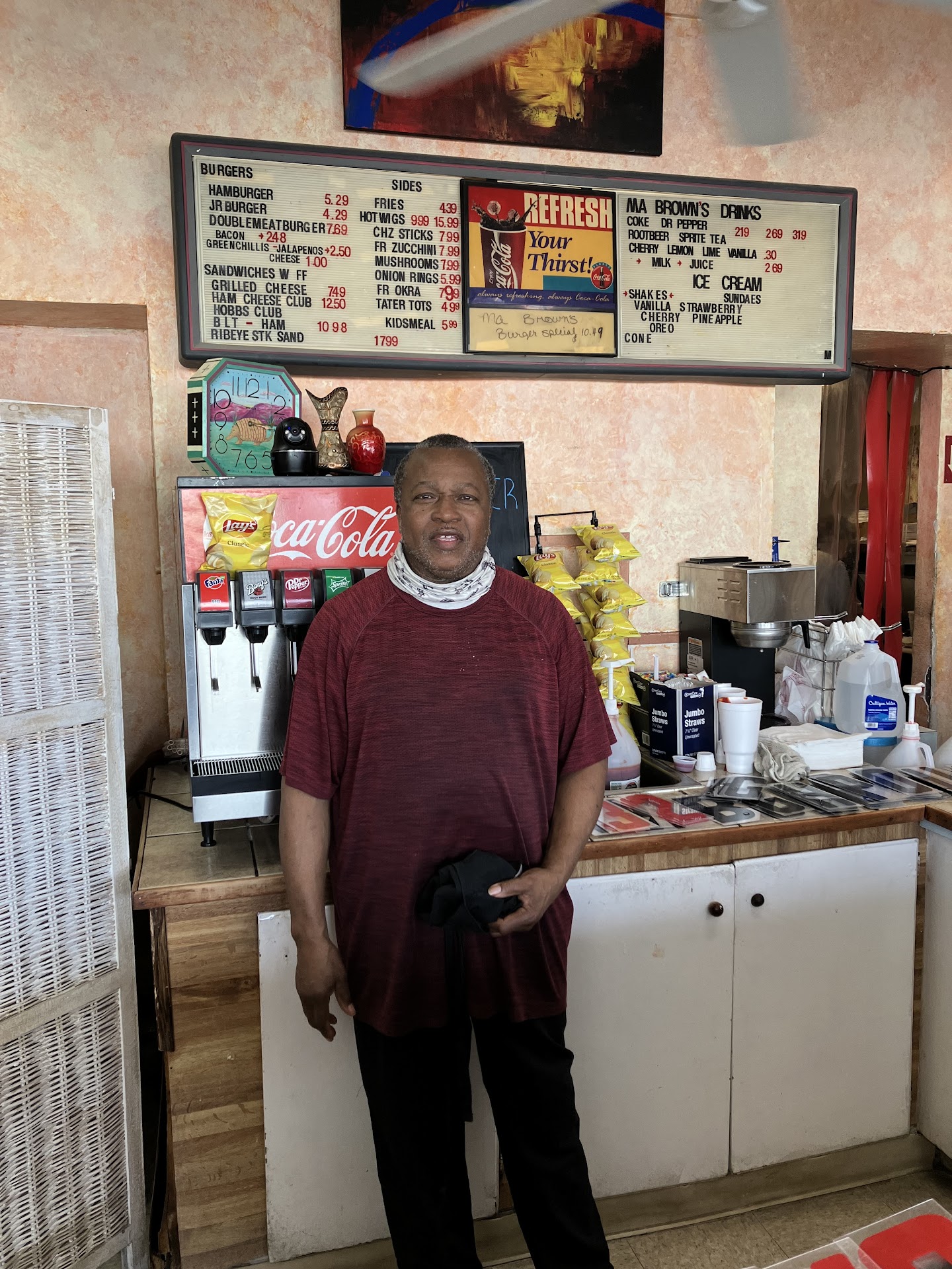 I was born in Hobbs, but moved away very young. My parents who lived here from the 50s to the 70s always talked about Ma Browns and how she had the best burgers. I've had bad and good burgers, but this is a great burger. The patty is hand-formed. You could smell the real meat cooking while waiting on order. The wait was long but that usually means fresh and it was worth it. The burger and fries were hot. The chocolate shake was one of the best I've ever had. The man, whom I take to be the owner, Ronnie, took my order asking me just how I wanted it made and did the cooking. Friendly without the usual scowl of chain places. Fast-food places even the ones who claim their food is fresh and real burgers need to look Ma Browns up and find out what a real old-fashioned hamburger is. I'm glad I listened to my parents and...
