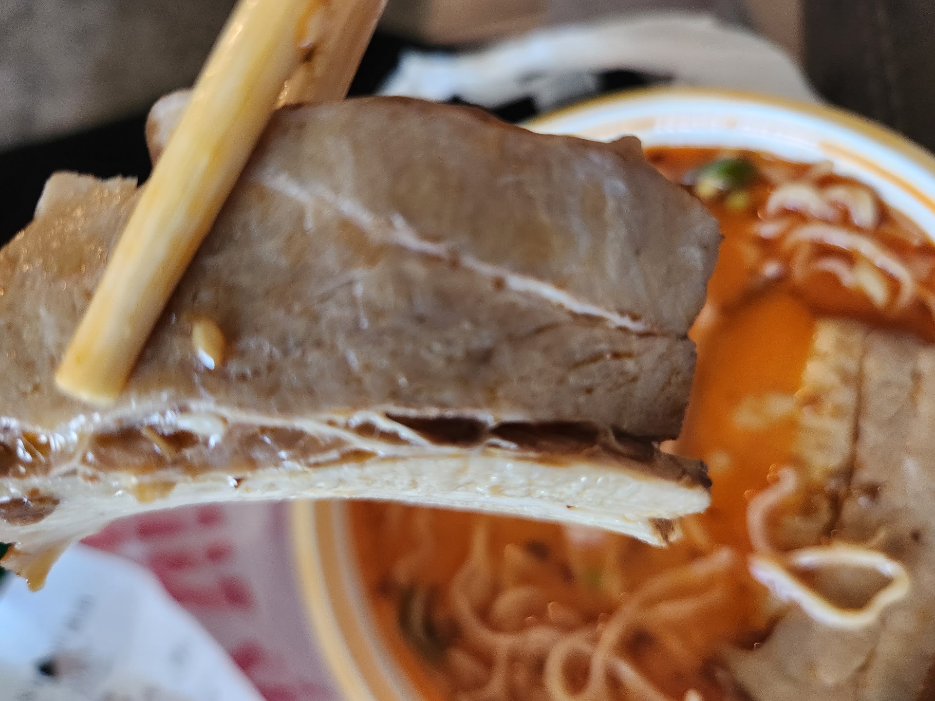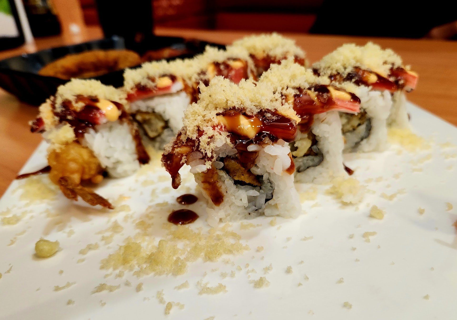 We started with the sushi roll (around $13.99), which came out first. Presentation was okay, but the service really set the tone for the rest of the visit. Our server was nice but clearly inexperienced — he brought drinks with only forks wrapped in napkins. At a place that serves sushi and noodles, that’s already a red flag. When the sushi arrived, there were no plates, no soy-sauce dishes, and not even chopsticks on the table. I had to actually ask for them, which just shouldn’t happen in an Asian restaurant.