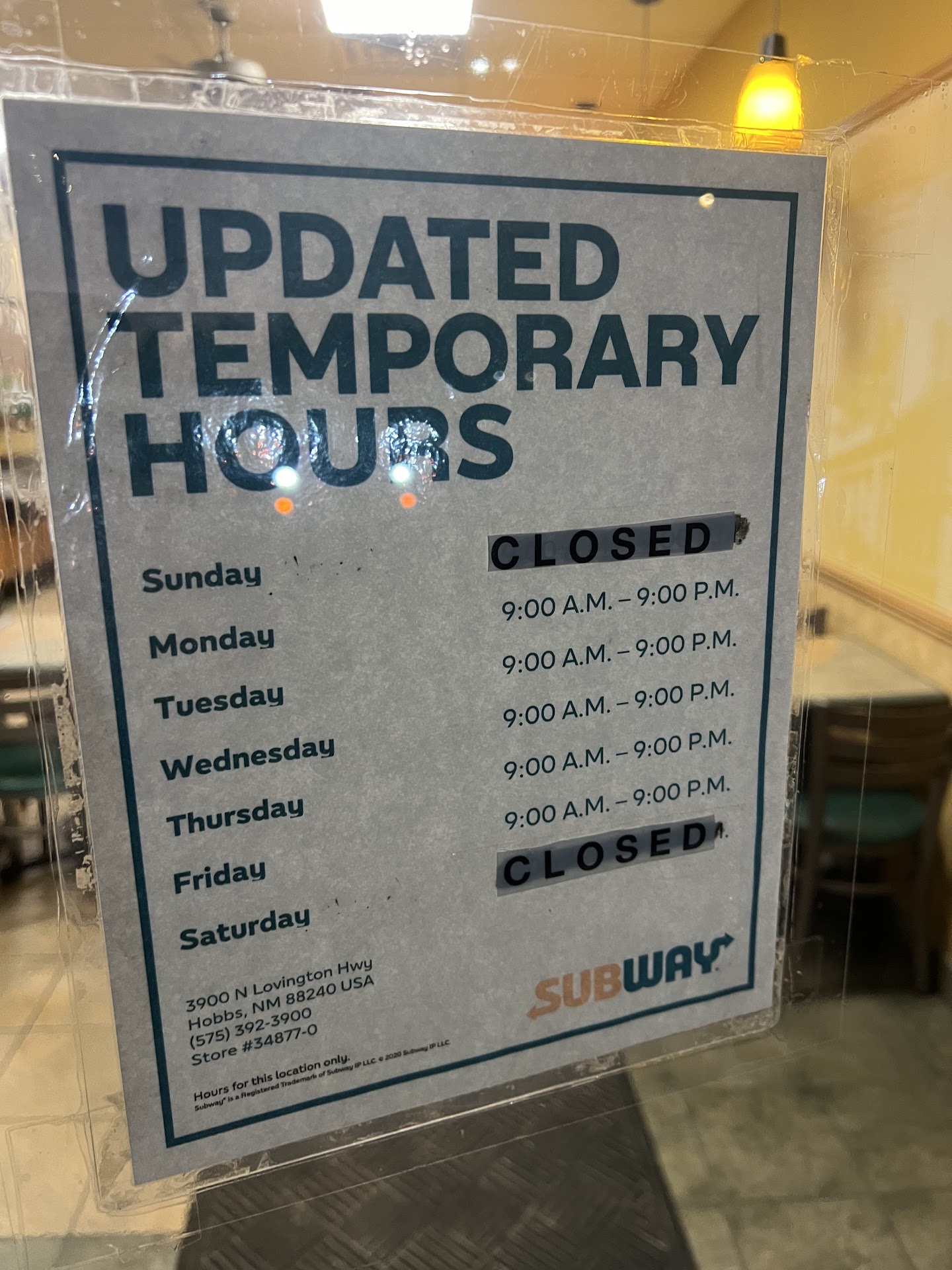 This is absolutely the best Subway in Hobbs. The hours have fluctuated but is due to pandemic prevention measures. Subway gives customers several ways to make & receive orders such as the mobile app-- which links you to special discounts , customers can use a delivery agency such as delivery.com ( I believe ), the newest addition would be curbside pickup. they do offer inside dining as well. With the seating arrangements is a prompt for customers to turn over when finished indicating the table/booth needs to be sanitized-- I found this a brilliant idea. Refills are not permitted. The company does also strongly recommend masks upon entrance. The employees are generally good and well trained. The current manager is exceptional-- welcoming, fast service, and deservingly recognized...