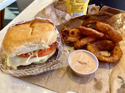 I decided on the Classic Cheese Burger with lettuce, tomato, pickles, sautéed onion, and opted for provolone instead of American cheese, accompanied by Onion Rings and bottled water.