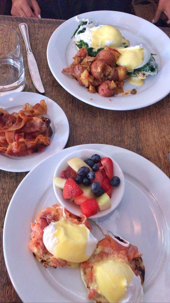 But the food was awesome. I had heard great things about AD's, so this was a long time coming. Two of us had the Florentine Benedict with potatoes and Smoked Salmon Benedict with fruit salad. Side of bacon, obviously.