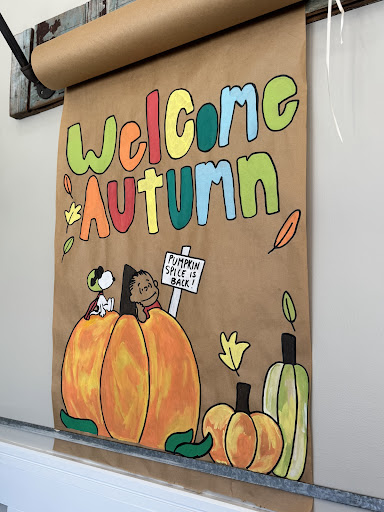 Right when you walk in, you’re greeted by a big “Welcome Autumn” sign — hand-painted, warm colors, and Snoopy sitting on a pumpkin holding a “Pumpkin Spice is Back!” sign 🎃. It feels personal, like something a local made, not corporate décor. The whole place carries that same homemade, genuine vibe — cozy, creative, and a little nostalgic.