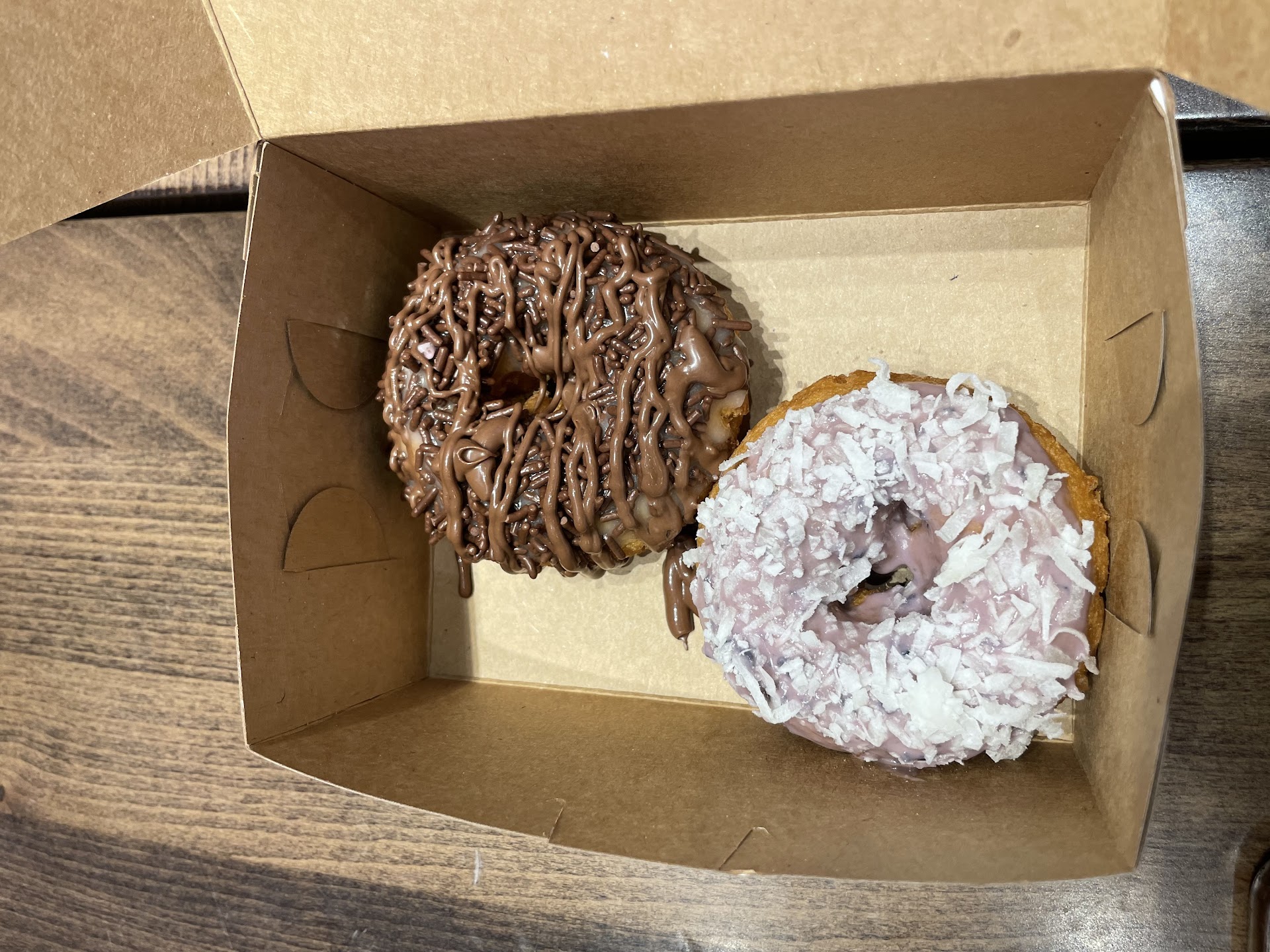 We also tried the donuts which are made fresh and have ridiculous customization. Was kind of expecting them to be hot and just fried. Seemed fresh but not hot though. Lots of customization. About 3 bucks for a small customizable donut - easy to get your sugar fix but I don't think this style donut is up my alley. Wife liked hers. Give it a shot.