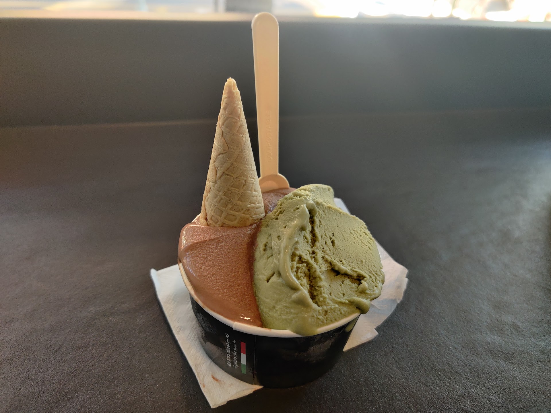 Very creamy just like gelato in Italy. The olive oil flavor is surprisingly good and my hubby likes the pistachio flavor even though he doesn’t usually have pistachio ice cream.