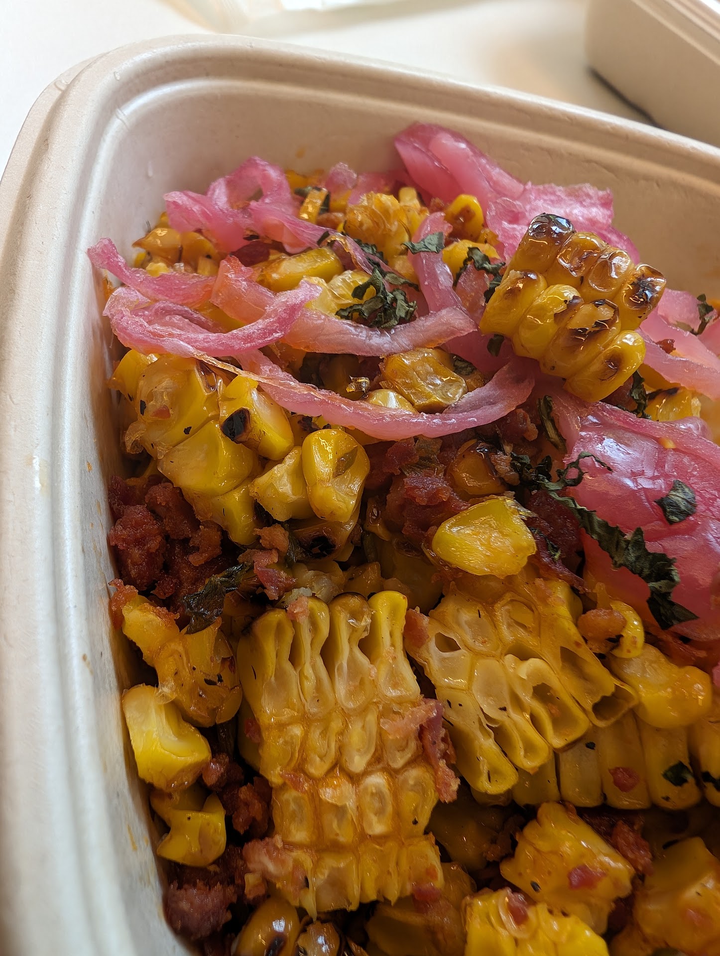 Second visit decided to bring the wife and kids (there's only a handful of tables - place is meant for takeout out - but we stayed since there was room). We got grilled corn with chorizo (amazing), garlic mashed potatoes (the garlic cloves just melt in your mouth), and a burrito that was huge but felt a bit light on the meat. Kiddo had the generic chicken tenders. Thin and lightly breaded. Basic, but she ate them and that's all a parent can really ask for sometimes.