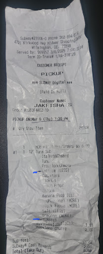 Read moreI should have checked the reviews....they are stingy. If they could they will give you only the bread. Service is terrible - I mentioned to the guy in the beginning "footlong Italian bread toasted". He puts turkey on the bread and I ask him to put cheese on one half of it which he did. We continue with veggies etc and I was like....did you toast it and he was like you never mentioned. I have been to bunch of subways and whether I mention or not (which I did in this case) they always ask before putting the veggies if the customer wants it toasted. He puts the veggies like as if there's a food shortage and then toasts after putting everything on it. I also asked him to put onion on only one side which he did. Then he quickly wraps the entire sub together- shouldn't you cut and wrap it separately especially because I asked cheese on only one side and onions on only one side. I tell the billing lady - that I need it separately wrapped and she goes - you should mention that before he wrapped. And I think you should ask the customer the right questions. Not going...