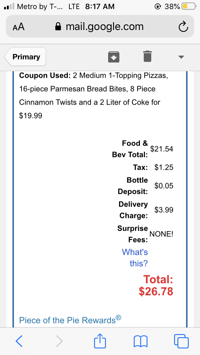 I have always associated Dominos with fast, convenient, While I do not expect gourmet quality from a pizza priced around ten dollars, I do expect it to be properly cooked and safe to eat. This experience has severely impacted my perception of your brand.