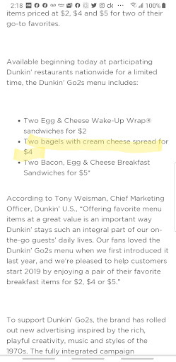 Read moreI am a loyal Dunkin customer that patronized this specific location at least 4-5 times a week, but today you lost a good customer. I ordered the $4 Bagel special (which I order frequently), and I was charged $5.93 instead of the normal $4.22!! When I asked why it was different from the special offered on the menu, I was told that "we charge extra for cream cheese"!!! and that is not what the special states (see attached). I tried to reason with your clerk, but she wouldn't budge!! I left without my bagels, and she charged me, which I have already reported to my bank!! Needless to say, YOU LOST A GREAT...