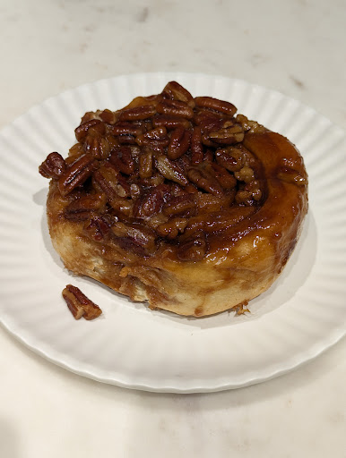 My mom and I shared a pecan sticky bun thing, and it was warm and delicious. Don't be fooled by the plate in the photo - it's actually a sturdy, reusable plate made to look like a paper plate. They also provide forks and cups for water.