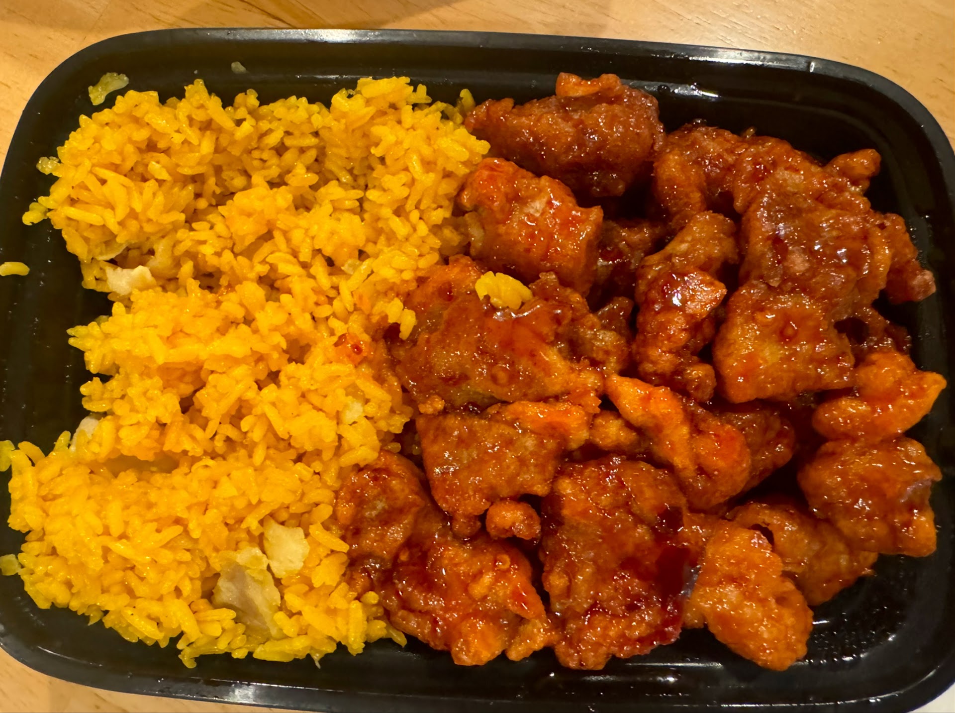 That rice not once touched a Wok at all, and there is no soy sauce in it. Flavorless and bland. The chicken that was in it (if that was indeed chicken) tasted like it was boiled before it was added to the rice. The texture was extremely off and slimy, we had throw it out.