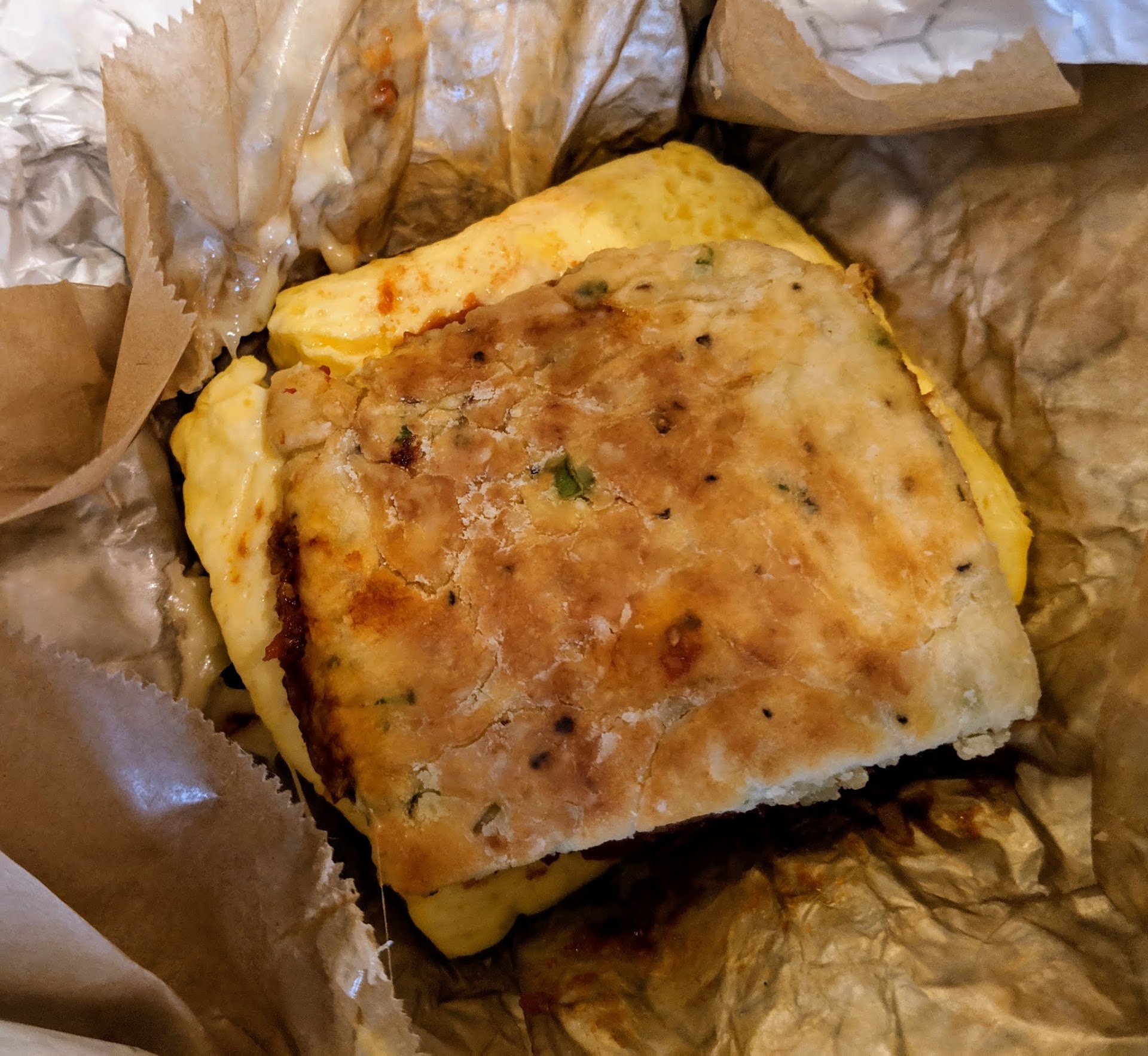 My breakfast consisted of the biscuit sandwich. I expected a fluffy biscuit, with a nice breakfast meat and scrambled eggs. What I got was some sort of soggy bread, marred by Italian-style herbs, a dense square patty related to eggs in color, and a piece of rubbery meat that can best be described as a failed microwave experiment. All of this was completely dominated by one flavor: The "tomato jam", which, as far as my taste buds can discern, is their term for pizza sauce. The sandwich had all the signs of being cooked in a microwave and the result was easily one of the worst I have experienced in a café.