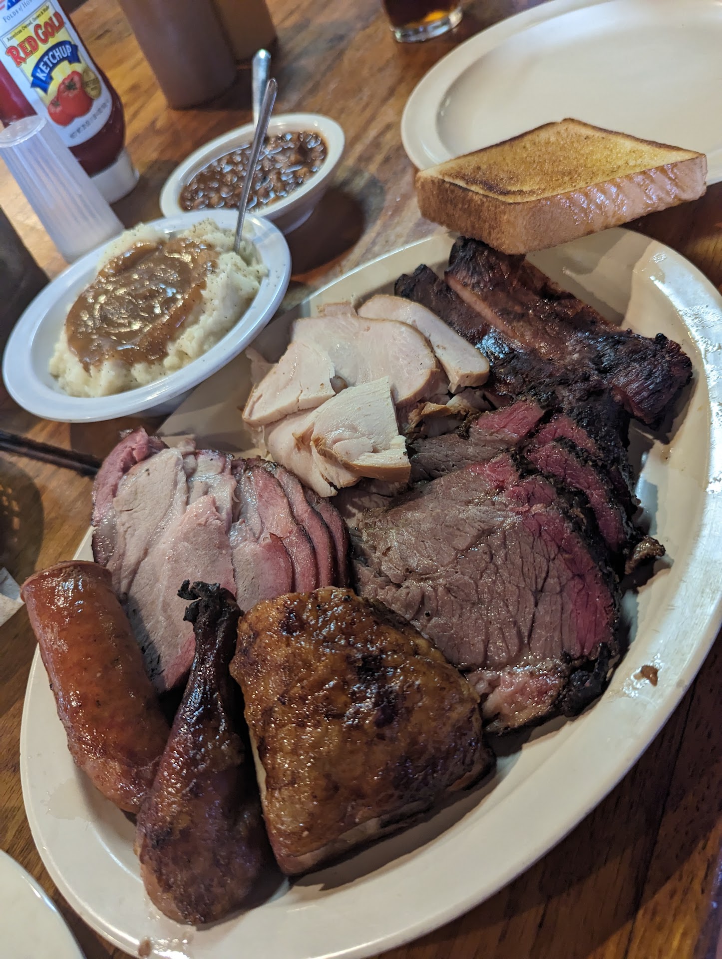 I ordered through Uber eats and chose to pick up my food personally. Upon arrival I was greeted by Josh. I was told that everything was in order and I was good to go. Upon getting the food home I called the location and spoke to Josh about the issues with the food. Missing items and the quality of the food as well. I was told that I would have to take up the issues with Uber eats. I thought about it and I called Josh back and explained the situation was clearly the stores fault. We came to an agreement that I could come to eat at the restaurant and agreed with the price for replacement for the $76.54 I had spent. So low and behold I went to the restaurant and received a warm welcome from Pauline the manager and seated ourselves. We ordered our food and drinks and waited patiently. The place was all but empty of a couple of tables and the rest of the employees were standing around talking. We got served and right away problem. I ordered the sampler brisket,ribs, white meat chicken,sliced turkey, pork and chopped pork, mashed potatoes with gravy garlic toast and coleslaw. The chicken was dark meat and I pointed it out and it was replaced. The diet Coke was flat and tasted nasty and the food was just as disappointing. The waiter asked about the food and I explained to him and his response was (that's unfortunate) . Nothing about getting a manager or anything else like can I fix it for you with something else. Just another plate of disappointment. After the conversation with the waiter I was hoping the manager would appear but nope. So I encourage you to be aware of this location and the practice of the way they treat you and your food. For the money spent and the time invested it's definitely a lot to be desired. Times are tough for lots of people that work very hard to just be able to go out to eat. Why do some stores treat patrons like garbage and not with due respect. If it was Pauline coming to my store I'd personally take pride and do the best I could to resolve any and all issues with anyone that comes to dine. Sadly Pauline chose to ignore the entire conversation with the...