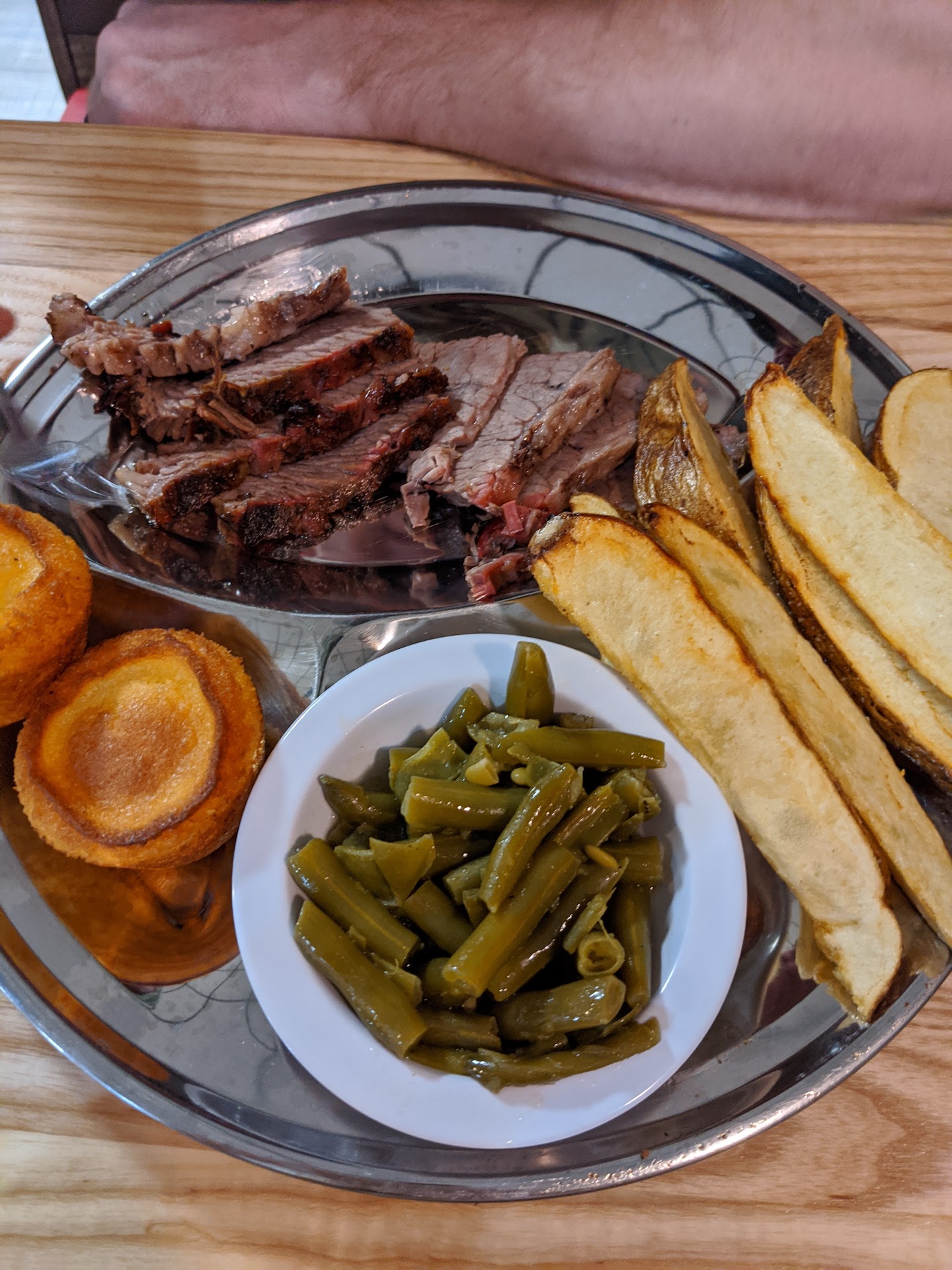 Read moreThis was my birthday dinner, very disappointed on literally all levels except meat portion size and our server eas awesome (Maggie). To start, there were a couple people playing guitars, appeared very dingy, music and singing wasn't pleasant, it was terrible and distracting. I went for one thing, and ONLY ONR THING, the brisket. Ordered the 1/2 lb platter (pictured) and it looked OK, no real smoke ring as expected. There was mild bark but not memorable. The brisket itself was tender and well cooked, just not smoked. The collards were passable if hot, same with the beans, barely warm. Thus was at 6 pm on a Friday, pretty peak hours and most wasn't really warm to include the cornbread. A different story, it was actually COLD like out if the cooler cold. We had a vegetarian with us, not any real options other than a salad. They said the would make her the super grilled cheese on a clean grill (no meat cooked on it), the $16 sandwich and steak fries showed up, you could taste beef on the bread and I swear the fries were cooked and under the lamp since the day before. Very unhappy, our server said she would get it taken odd but then the manager came over and s!I'd they would NOT take it off as they 'tried to accommodate her', I tasted the sandwich and not only tasted the beef on the bread, the cheese wasn't melted inside. This was a $16 dollar sandwich!! The manager was rude, knew it was my birthday and didn't offer anything so we left totally irritated, birthday ruined and recommend YOU DONT EAT HERE, WE NEVER WILL AGAIN. Whoever runs the smoker needs to learn how to do a brisket as they have no clue what it should taste like. Save your money, much better bbq can be found for less...