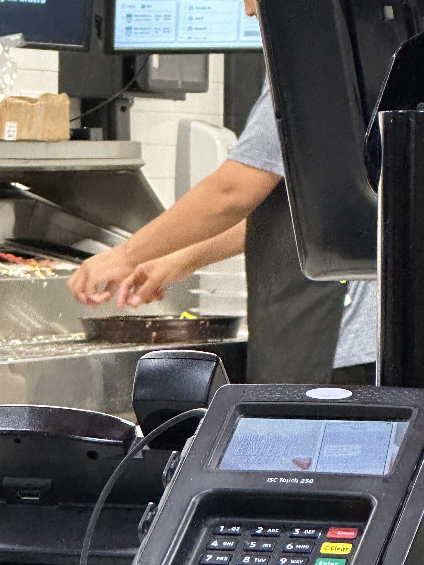While I waited, I listened to the young lady talk about getting her animal neutered and her dislike for the sanitation at that particular location. I watched her touch her hair and hat then move on to make the next incoming order, WITHOUT washing her hands.