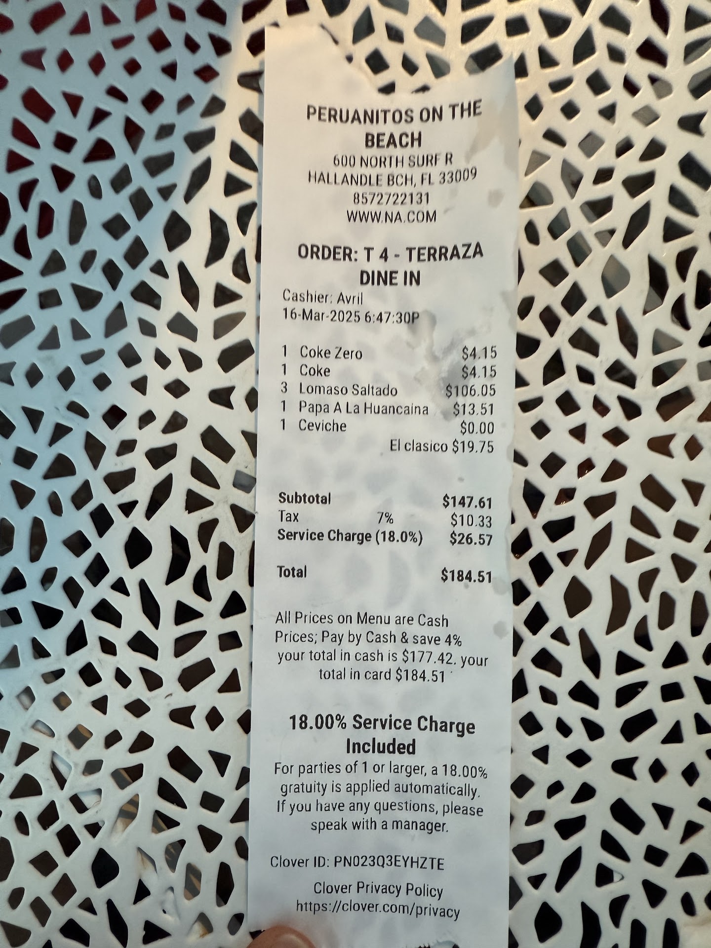 Read moreI had high expectations for this place given the reviews but boy what an awful experience. Definitely not authentic Peruvian food as found out the owner is Colombian. He is actually the annoying chubby guy talking overly loud and sarcastically to customers. The beef lomo saltado we had was supposedly made with filet mignion but this is not true at all. The meat we got served with our lomo saltado was tough to cut and even tougher to chew. The Papa a la huancaína we had was overly bland in taste and the fish ceviche needed more flavor as it tasted of pure lemon only. The service was horrible. Saw our waitress only one time and that was to take our order and I had to get up twice to ask for salt since it wasn’t brought to me the first time I asked so that I can season the overly bland unauthentic an overly priced food. Not to mention that the owner of this place like in true Colombian fashion is ripping people off by charging an extra 4% fee if you pay by card and has the audacity to charge you on top of that an automatic 18% service fee even if you are just a party of 1 (see the attached receipt). Please take my advice, stay away from this place and go to Pachamanka Authentic Peruvian Cuisine if you want to taste real authentic Peruvian cuisine; it is right up the block only 2 or 3 min walk and...