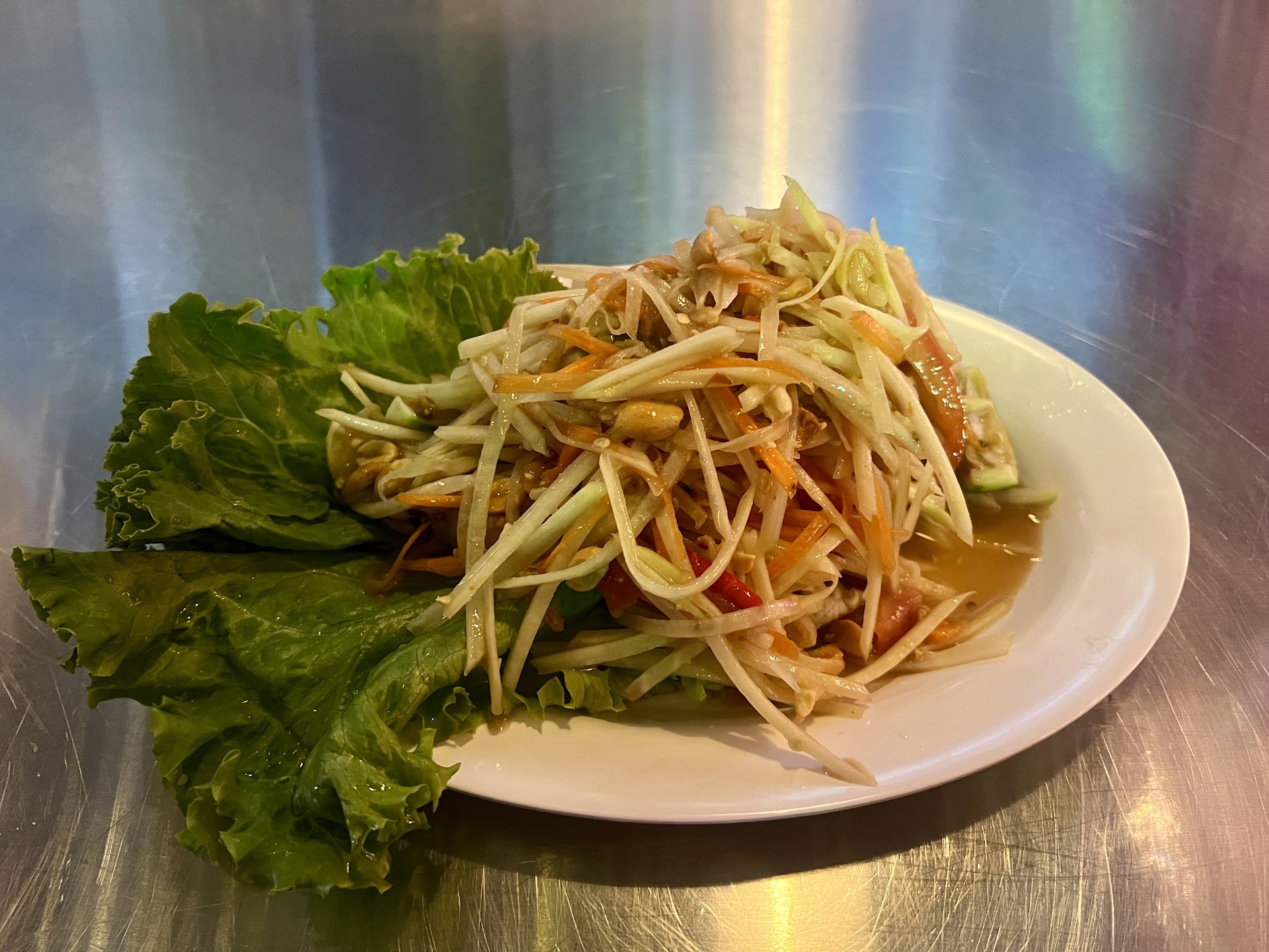 We started with the Papaya Salad (Som Tum), which is one of my favorite things to order and it did not disappoint. So fresh, well-seasoned, and the medium spice level was spicy but I thankfully still have my tastebuds intact.