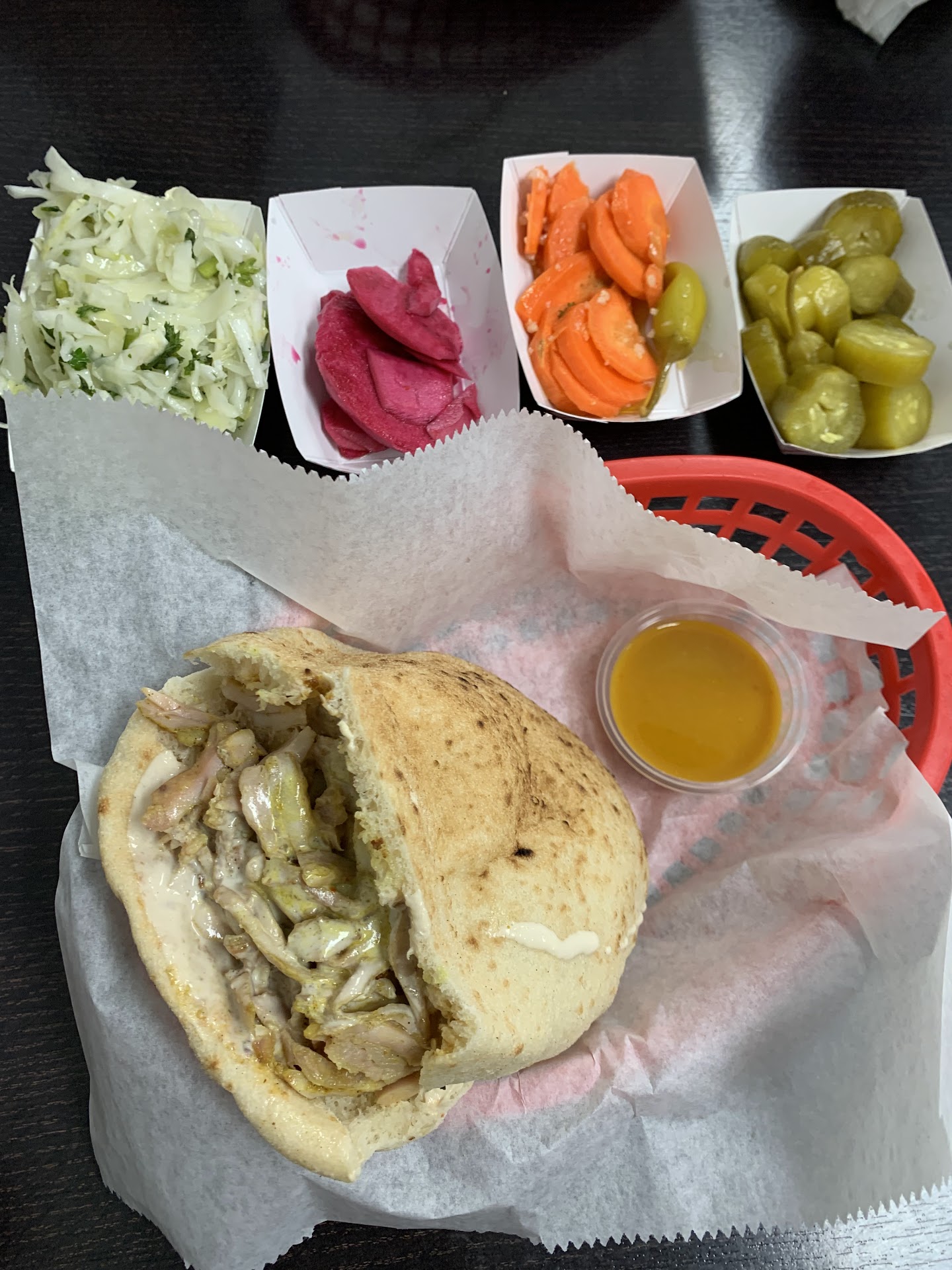 I ordered a plate that included shawarma, fresh pita, crispy fries, rice, roasted vegetables, and a variety of salads—and let me tell you, everything was beyond exceptional. The pita is soft and warm, ideal for scooping up that heavenly hummus. The red cabbage slaw and Israeli salad added the perfect crunch and tanginess to balance the dish.