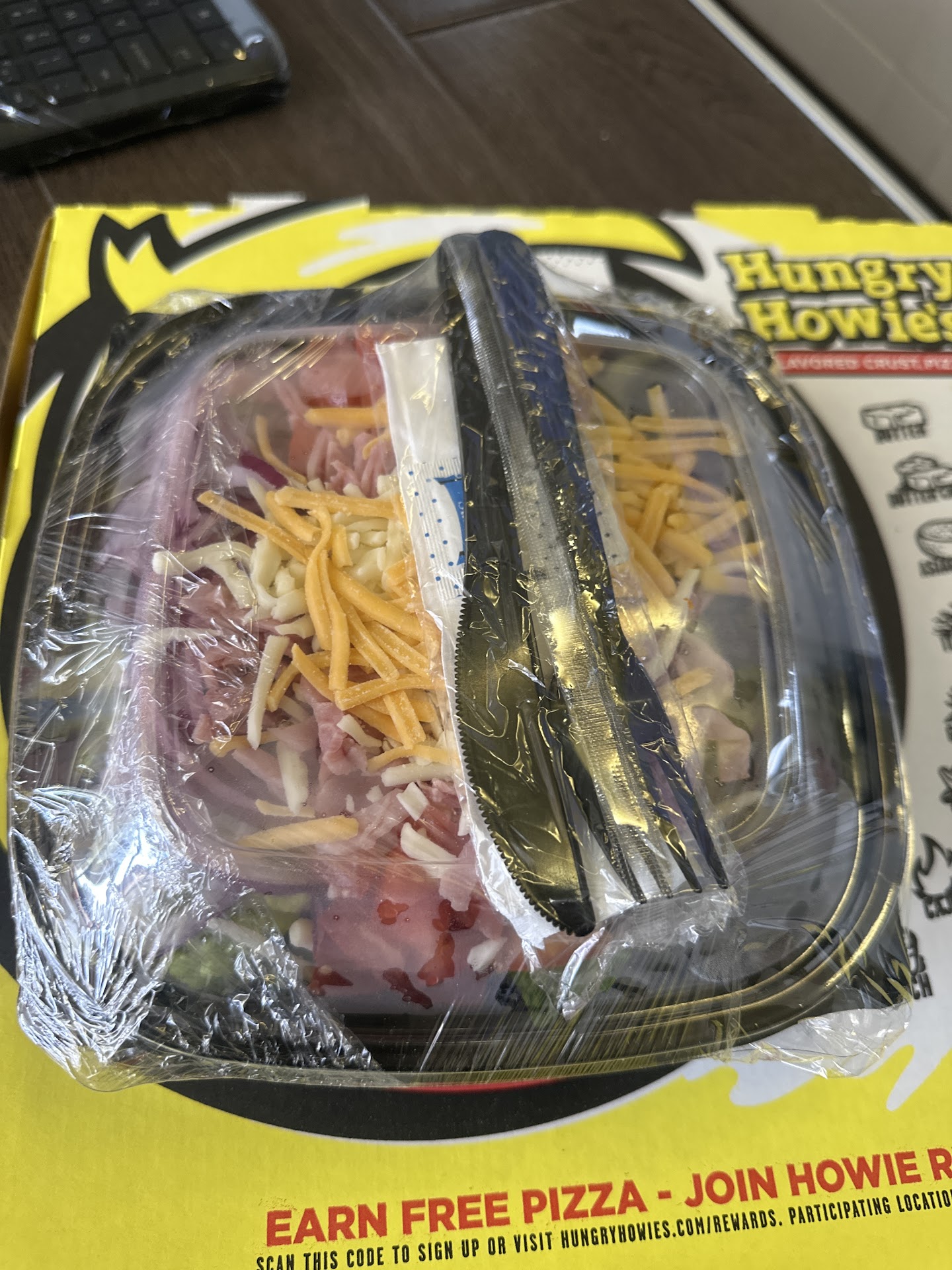 The pizza was baked nicely with a savory tomato sauce, topped with fresh ham & pepperoni, and crust flavored with garlic & herbs. I previously stated on two reviews that I wouldn't order wings from a pizza place, and once again, I've been proven to stick to that statement. I opened the box to my disapproval of eight very tiny wings, which was too spicy for me to eat. I didn't know their chicken was buffalo style. When I checked their menu online, that was the only way their chicken was made. I gave them all to my son. Their bread was ok, I just didn't like the seasoning that covered it. After managing to cool the burning sensation in my mouth, I'm not sure if I'll ever return to Hungry Howie's. The food overall didn't...