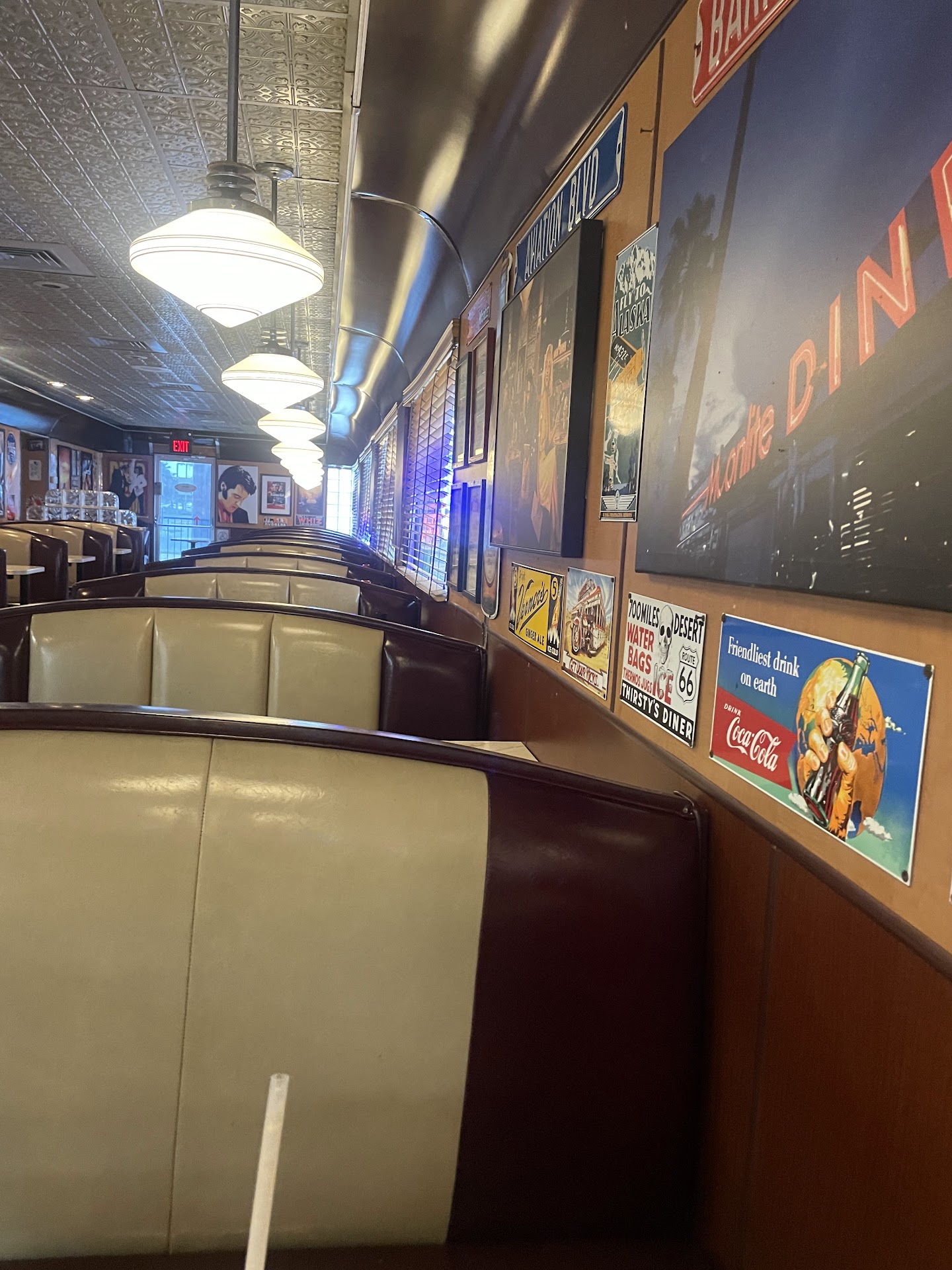 me and my son came here for dinner. I've driven past this place a thousand times and decided to check it out. upon walking in, we were greeted and shown to our table. There were two other tables with customers, and the rest of the diner was empty. the waitress took our drink orders and returned with them. my son's cup(styrofoam) had a small hole poked in it by the ice. no big deal, our waitress replaced it. he ordered the cheese burger and I the fish and chips and a small house salad. the salad came out first. I waited a few minutes for silverware and eventually went behind the counter myself to get silverware and napkins. There were bits of lettuce that started to turn and were brown and slimy. The cucumbers, you could tell, had been sitting in a warm bin all day. They were soft and warm. the red onion was chopped into tiny little pieces, and the croutons were stale. when my entree (fish and chips) came out, it looked very good. I grabbed a fry and was instantly disappointed. how do you mess up french fries at a diner? they were obviously cooked earlier and thrown back in the fryer to order. The piece of fish was cooked well. However, there was a blood vien running right through my piece. I was so hungry I attempted to eat it anyway. the coleslaw was OK, which also came as a side with the entree. My son said his burger wasn't good either, and he didn't finish it. this kids' diet is 60 percent cheeseburgers. Anyways, I'm more or less glad I stopped by instead of wondering how it is? Now I know. I did let the waitress know that these are the worst fries I've ever had. She let the manager know, and she came over to me and asked if I'd like them remade. I declined since the cook asked what was wrong and seemed very angry his culinary skills were not up to my standards. I do not...