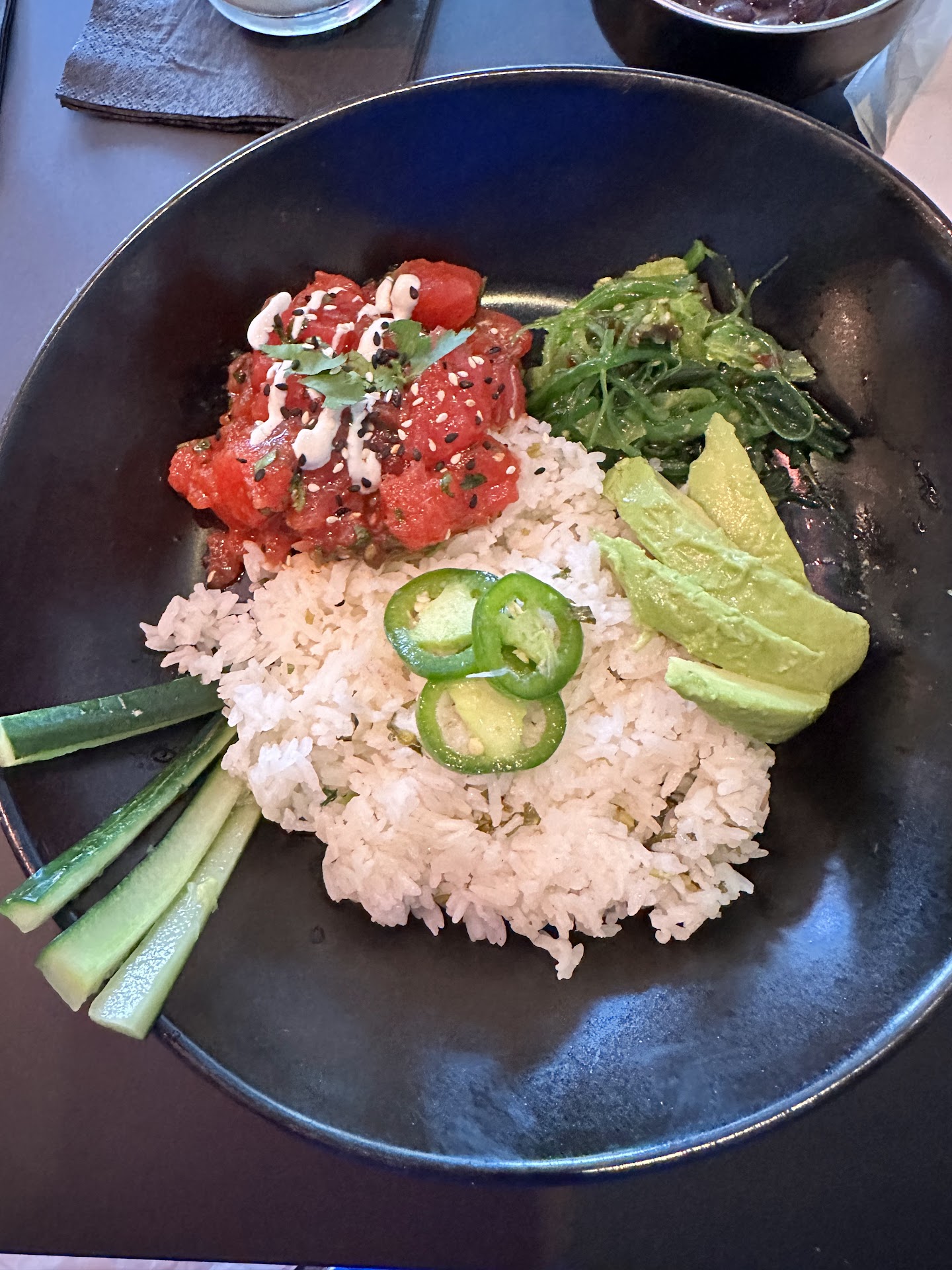 Read moreJust one block south of Hollywood Boulevard, this small Mexican-Asian Eatery packs a big punch. From their delicious vanilla horchatas to their bowls, you are sure to find something you will like. As soon as I was seated I was greeted and brought a small glass of cold water (big points!) I got chips and salsa to start. It came with homemade chips that, although in the thicker side, were freshly fried and salted. The small wooden tray also included red salsa and guacamole. The guacamole was fresh! A little more lime for my taste but delicious nonetheless. The menu offers tacos, quesadillas, bowls. But some feature an Asian twist so why not try something different? I went for the tuna crudo bowl. The bowl came with cilantro-lime rice, yellowfin tuna, kimchee sauce, cucumber, sliced avocado, cilantro, fresh jalapeños and cumin-lime crema. The tuna is the clear star of this dish! Now I need to try their tuna crudo tacos!! I also ordered a side of their black beans which needed just a pinch of salt but other than that, they were very good. Service was friendly, prompt and courteous. I will definitely be back to try some of their other items...