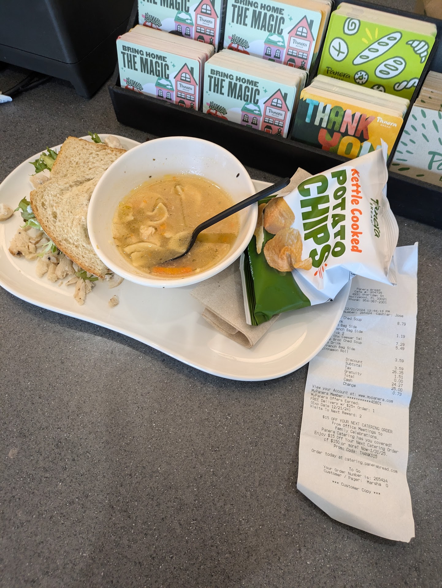 Read moreWent in around 8pm. Wasn't overly busy. No one else was in front of me ordering. Went to wait for my food since it was to go. As I was waiting I witnessed what is possibly the least professional exchange of pertinent information between workers. They were out of turkey. "Go ask this guest what kind of meat they want- no wait we have it!" After the employee already returns with a substitute order. Constant calling back and forth of problems in front of other customers waiting. And it took over 15 minutes for my order to come out- soup and a chipotle chicken avocado sandwich. Which is pictured with my review. And has very little anything on it aside from bread. I've been to many a Panera in my life. This is by far the least consistent and horribly trained staff I've seen. I do realize the location is "new" but it's been open over a month. Plenty of time to correct training issues.