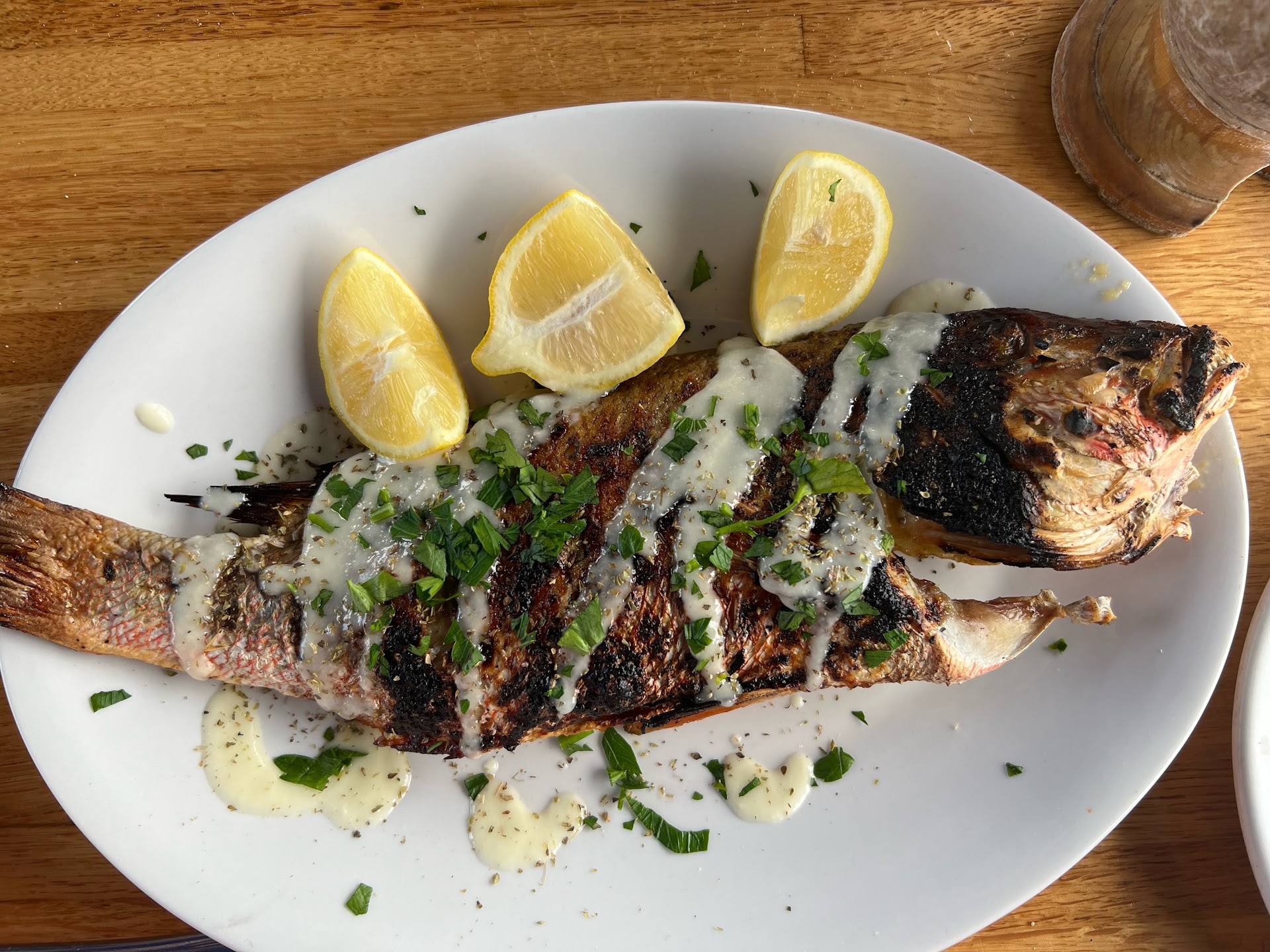 Third, I ordered the Branzino. It was $30, but comes with NO SIDES?!? AND, I have to debone it myself??? Maybe this is the traditional Greek way? I don’t know, but it was not enjoyable to be constantly taking fish bones out of my mouth. I would really expect a $30 dish to come with rice, or potatoes, or grilled vegetables, or a salad. Anything! I ordered a side Greek salad to go with it, but of course that was kind of big, because it’s not really a side salad. I will say that the fish was very good. I did enjoy its texture and flavor. Had it been filet I would give it 5 stars. But since it was whole, with bones, I give it 4. Coming without sides, it goes down to three stars.