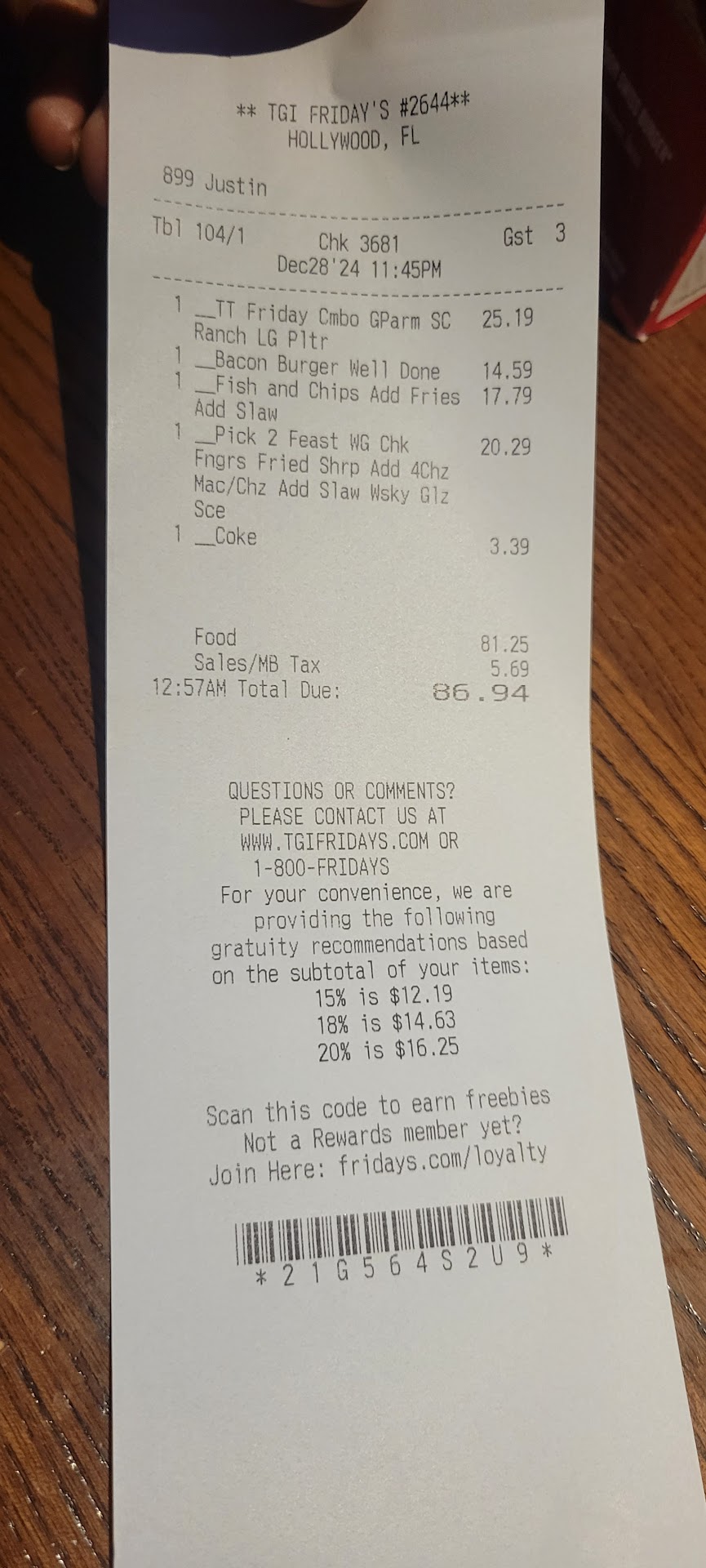 Ā Ā Ā Read more11/02 āLetās get something different tonight, Iām tired of us playing it safeā famous last words before we decided to order TGIFridays. My husband and I decided to order TGIFriday as a treat. Unfortunately we were EXTREMELY disappointed. From missing items, to mysterious items to just bad tasting food. My husband got the New! Fridays Feast Pick 2, no AB sauce on the chicken fingers (although we asked for it), no side order of garlic bread we asked for, and no side order of apple butter sauce. The chicken fingers have 0 flavor, but also tasted like it was fried in old oil. The half rack ribs tasted burnt and had no meat on it. If Iām being honest, the ribs (in both his and mine) tasted exactly what old sewage water smells like, I know itās a gross thing to describe it to but itās the only thing to best describe it. I ordered the FRIDAYS ⢠Big Ribs, Mac and cheese was decent, the ribs like I said were not good, my order was suppose to come with a Coke Zero and I got some mysterious apple juice/Beer looking drink that smelled like nothing so I could not tell what it was (immediately down the drain) clearly not what I ordered. I ordered a side of mashed potatoes and I did not receive it, the 1 item my toddler really wanted, gave him my Mac and cheese and my husbands fries instead. In total including driver tip, we paid $60.89. An it was not worth it. Kinda of disappointed. I called the restaurant and spoke to a young lady who I told what happened and she said she wrote down my name and number and sheād let her manager know to give me a refund , she also said if I donāt see a refund reflect my account to call in 2 days to speak to the manager. Itās really a disappointment because we have had TGIFridays for years and never had an issue till now. Not sure if it was just location that was a miss or if TGIFridays has just lost...
