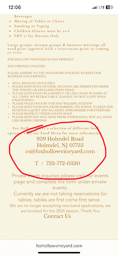 My Fiancé and I have been long time patrons and after a recent visit felt compelled to share a few honest thoughts. Firstly, the grounds are lovely and the surrounding area is both bucolic and comfortable. The wine itself is typical quality for New Jersey, not overly good but passable. The live music is great and the fire pits are a must in the cooler weather. Now, the negatives: When we approached the entrance, we were abruptly stopped by a staff member who demanded my fiancé open her purse. What are they looking for? Weapons? Contraband pretzels? I was later to discover they are trying to prevent patrons from brining in outside food. Firstly, there is a large sign with the myriad of Fox Hollows rules clearly stating that no out side food is permitted. Shouldn't that suffice? Aren't we all adults here? We've visited dozens of other wineries and this is the very first time we were searched. Further, Fox Hollow seems to tailor it's rules to optimize profit without consideration for it's patrons comfort or enjoyment. Look, it's a business and, of course is looking to maximize revenue but there are two rules in particular which I feel greatly detract from the experience. Firstly, they insist you buy their wine by the glass only. You're able to buy a bottle ONLY if you take it home. You are NOT welcome to open it and enjoy it there. This seems to fly in the face of reason. You are spending your hard-earned money on their product and supporting their business but by NO means are allowed to enjoy it there. What? Please explain this to me! Secondly, an even more perplexing rule: While we were extremely pleased to hear that Fox Hollow now offers flights to sample their wines, we were taken aback by their seemingly nonsensical rule that prohibits you from enjoying the flight on the grounds. When we attempted to cart our wine to a seating area just outside from the bar area, we were hastily intercepted by an over zealous employee who insisted we go back to the bar area. Frankly, it was embarrassing and several of the people on line commented on just how foolish and seemingly arbitrary rule it was when they saw us returning with our unfinished flights in tow. I, myself, am a business owner for 35 years and would be aghast at making my patrons feel so uncomfortable. If these rules were changed, I'd be happy to award 5 stars to Fox Hollow. Till...