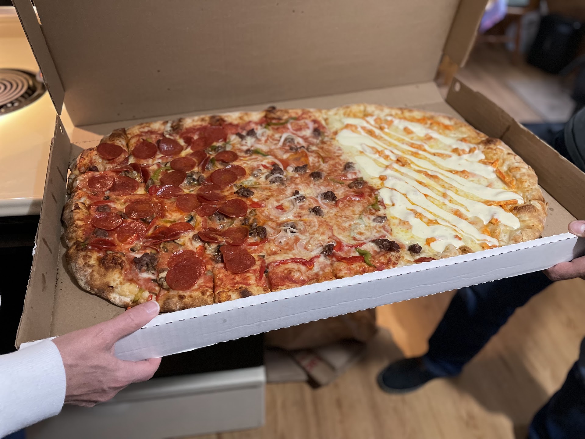 Love this place 😍 HOWEVER its very unfortunate that you have to ASK the delivery driver for your change because for sum ODD REASON YOUR CHARGED $3 FOR DELIVERY THEN HE JUST CASUALLY WALKS OFF WITH YOUR CHANGE LEAVING U STANDING IN THE DOOR WAY LOOKING LIST. SO A $14 SMALL PIE TURNS INTO $20 ITS ABSOLUTELY RIDICULOUS AND MANAGEMENT SHOULD TALK TO HIM BECAUSE THATS NOT RIGHT. I SHOULDN'T HAVE TO ASK FOR MY CHANGE AND A SMALL SHOULDN'T COME UP TO $20 BECAUSE THE DRIVER FEELS...