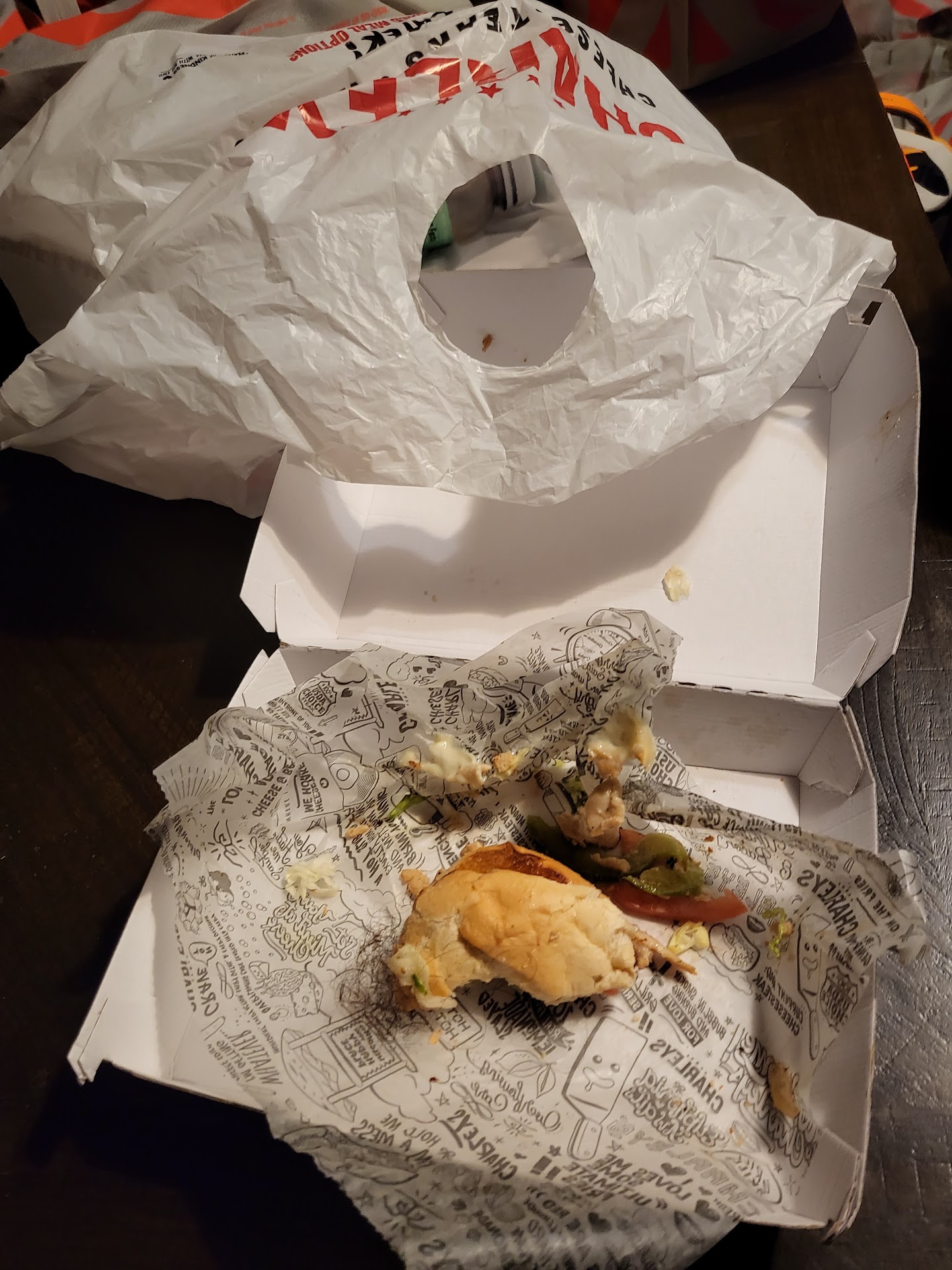 Warning! I was at the Holyoke Mall Charley's, about 3 weeks ago. I sent pictures of my sandwich to Coperate and still haven't heard back from anyone. The service was not bad or good. I was looking to get something to eat. However, I was almost done with my large sandwich and bit into the other half, and that's when I had hair in my mouth. I spit it out and turned on the light in my car. To my surprise, what I thought was a string of hair turned out to be a lot of hair. Very...