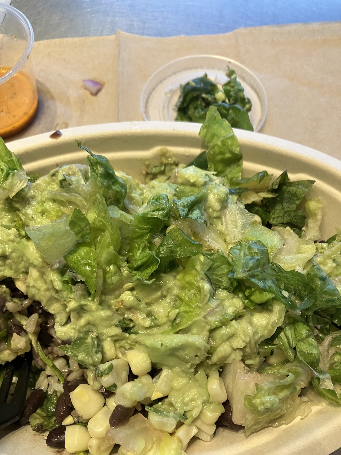 But at least our food is A+ other than the chips, right? Of course not. One coworkers was missing fajita veggies that he paid for, another coworker had white rice when he had ordered brown, and I was missing queso which of course I also paid for. Maybe the order could have been made properly if each employee took responsibility for one meal and put the proper amount of time into each, instead of 3 of them standing around saying things like "I don't give a F about these customers" while one poor guy struggled to get multiple orders together.