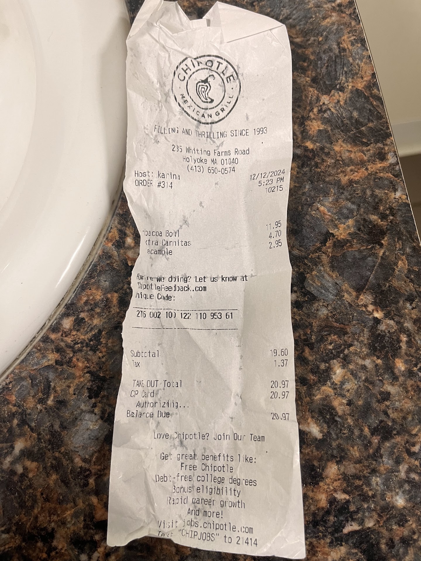 They get all the way to the end of my order and THEN inform me that they don't have chips. Did I pay for chips? Yes. Can I get a refund? No, I have to call Chipotle Corporate to get that. That one's not on the employees, but perhaps if they had noticed my order in a timely manner, they could have called me in advance and at least I could have told my coworkers not to expect chips. My phone number was on the order. But of course they didn't even read my order in the first place until AFTER I walked in.