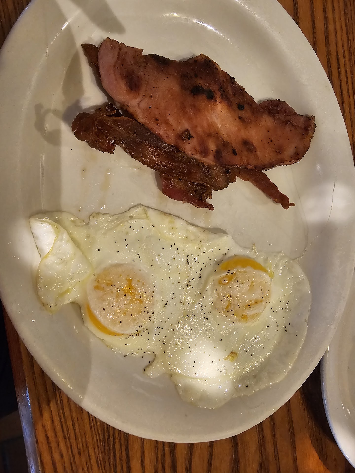Read moreFood tasted good, server (Trisha) was attentive. We appreciated being (voluntarily) served the complimentary biscuits/corn muffins with butter. Most times that's not the case. The bacon could have been a mite chewier/softer. I have to make a point of asking for CHEWY bacon - otherwise it's so dried out and brittle - you'd swear it came out of a dehydrator. The knife & fork could have been a little sharper - the bacon and pancake were a tad difficult to cut with the utensils I had. The ladies room needs to be gutted. (I obviously can't speak for the men's room. lol) The floor is always greasy & the concern of slipping and falling is always on my mind upon entry. First and foremost, the bathrooms need their own mop & bucket - they should NOT be using the same one used in the kitchen. It is NOT sanitary! I am NOT convinced this (separate buckets/mops/cleaning paraphernalia) is practiced at this western MA location. Second, the toilet hardware/pipes is terribly corroded with green and quite the eyesore. Third, the size of the stalls and how ridiculously low the toilets are to the floor level really leaves something to be desired. For what it's worth - IMO, I think all stalls should provide high toilets and grab bars for safety. Also - access to toilet paper dispensers should be ABOVE the safety rail. Positioned below the safety rail seems UNSAFE in that it forces one to lean forward - what's to prevent the person from falling off the toilet because they have to reach so far forward to get the necessary...