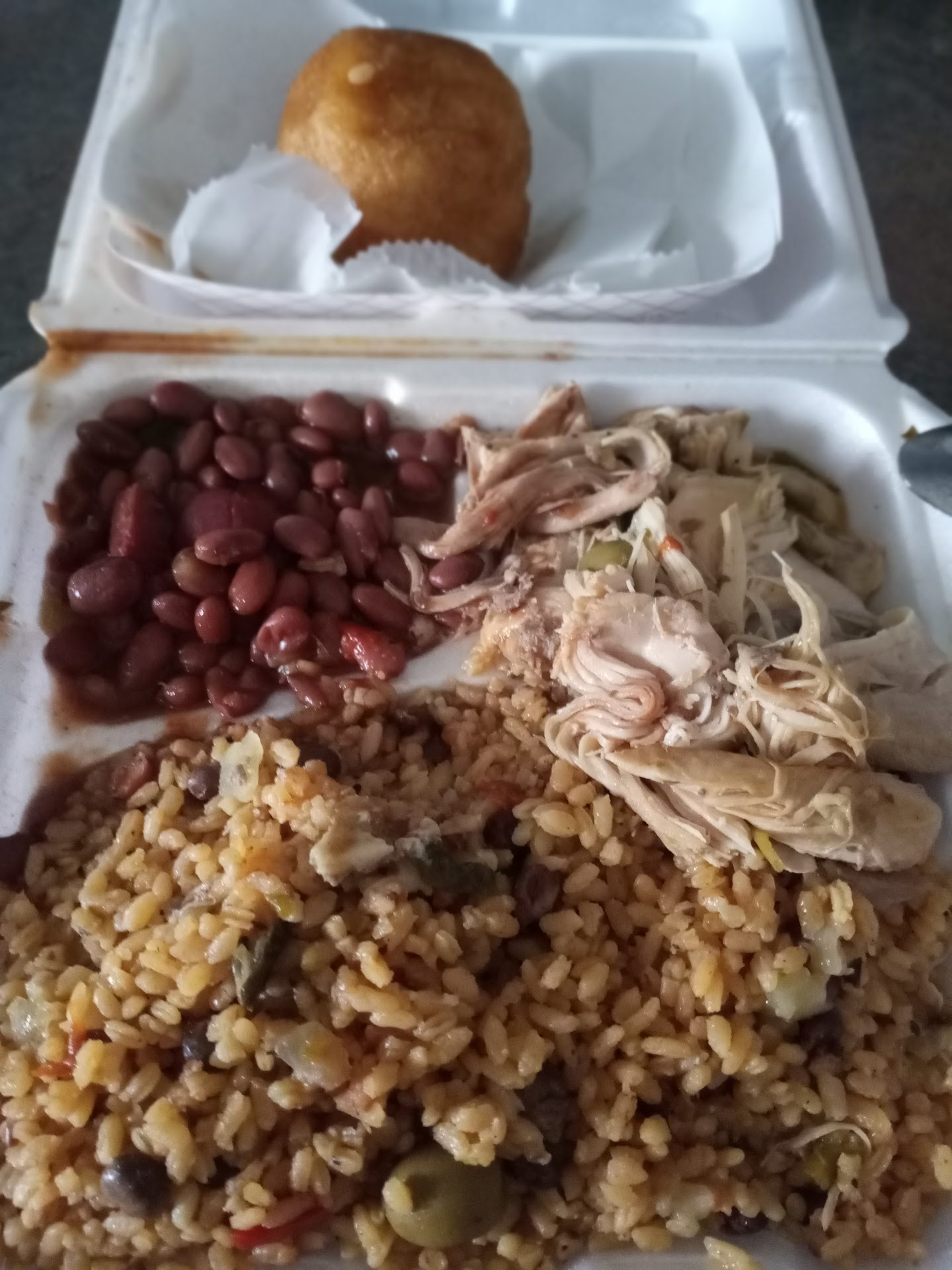 I ordered a small meal of yellow rice (arros) with gandules, beans & Pollo guiseau (stewed chicken) & a potato ball (additional cost) Each component is packed with flavor!!! The potato ball is crunchy on the outside & silky smooth potato inside with flavorful beef.