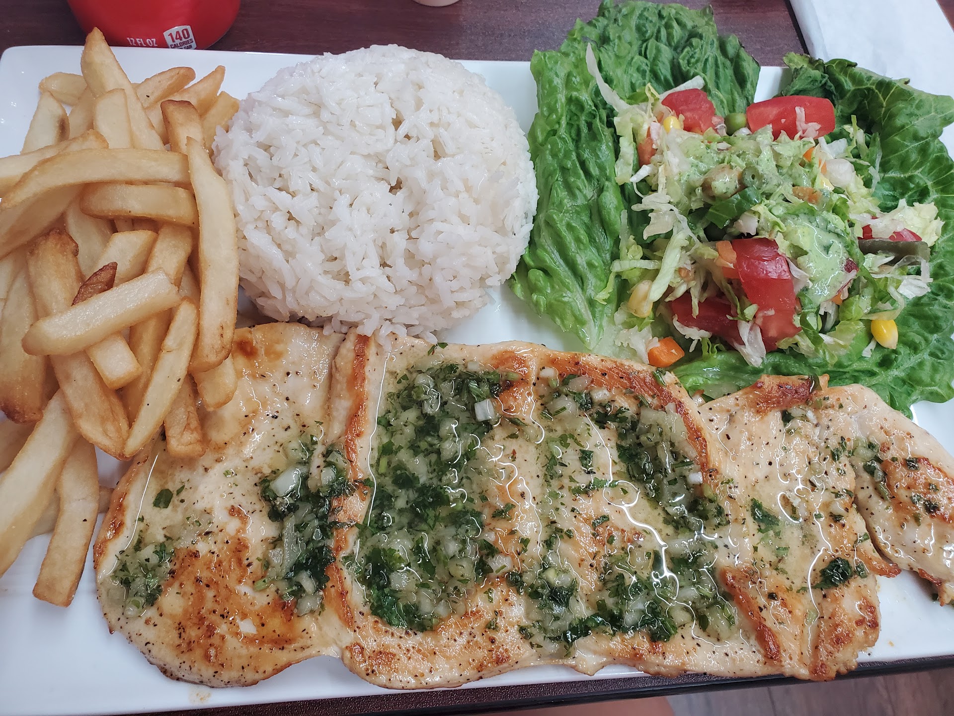 Delicious, flavor filled, fresh food! It truly is a hidden gem. The atmosphere was welcoming and the restaurant it self was clean. I ordered the grilled chicken, I expected just chicken and rice and I got that along with fries, plantains and salad topped with "paraiso dressing" which was very tasty! The sauce on the chicken was different type not sure what but it was filled with flavors and the meat was grilled to perfection.