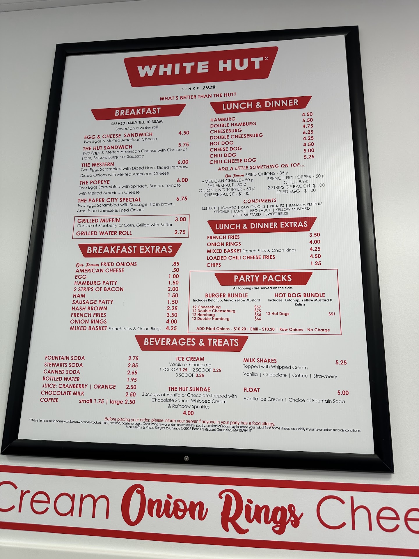 Read moreFirst time ever going to white hut very disappointed, place was nice , service was ok, me and my husband had a lunch date which was disappointing in food cause it wasn’t good, I order cheeseburgers that was tasteless and greasy the paper to wrap it up was full of grease it was gross , the onion ring was on the fries where ok no taste or salt. My husband order a double cheeseburgers and when he open it , he said it was disappointed with the taste and greasy taste he wasn’t impressed at all and our meal was $25 we could of gotten more at Burger King and would of been satisfied very disappointed for...