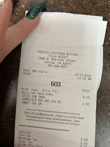 Read moreI decided to visit the Popeyes on McKinley in Corona CA during my 1 hour lunch break. So I placed an App order 15 minutes before I drove there thinking that my order would be ready when I arrived to pick it up in the restaurant. The service from the associate at the counter was good. However, the services from the staff working in back including the management is terrible. I was told it would be a 10 minute wait for spicy chicken to come out from the fryer. I was completely okay with waiting 10 minutes for fresh fried chicken. However, that whole batch of chicken was all served to the drive-thru customers. Once I noticed this, I informed the associate that I was already waiting for that chicken before any of those drive-thru customers placed their order. The associate told me I now had to wait 20 more minutes for more chicken. I ended up waiting 35 minutes in the restaurant. By the time I got back to work and in the break room, I only had 5 minutes to eat, and I just ended up taking most of the food home and microwaving it when I got home. So the point of my story is if you're in a hurry or you place an order on their App, you better get in the drive-thru line no matter what. Drive thru customers are first priority at this Popeyes, and you will receive your order way faster. I will never come to this Popeyes again for lunch. I will say that the one piece of chicken I had time to eat was very good. By the way, there was never an apology from any...