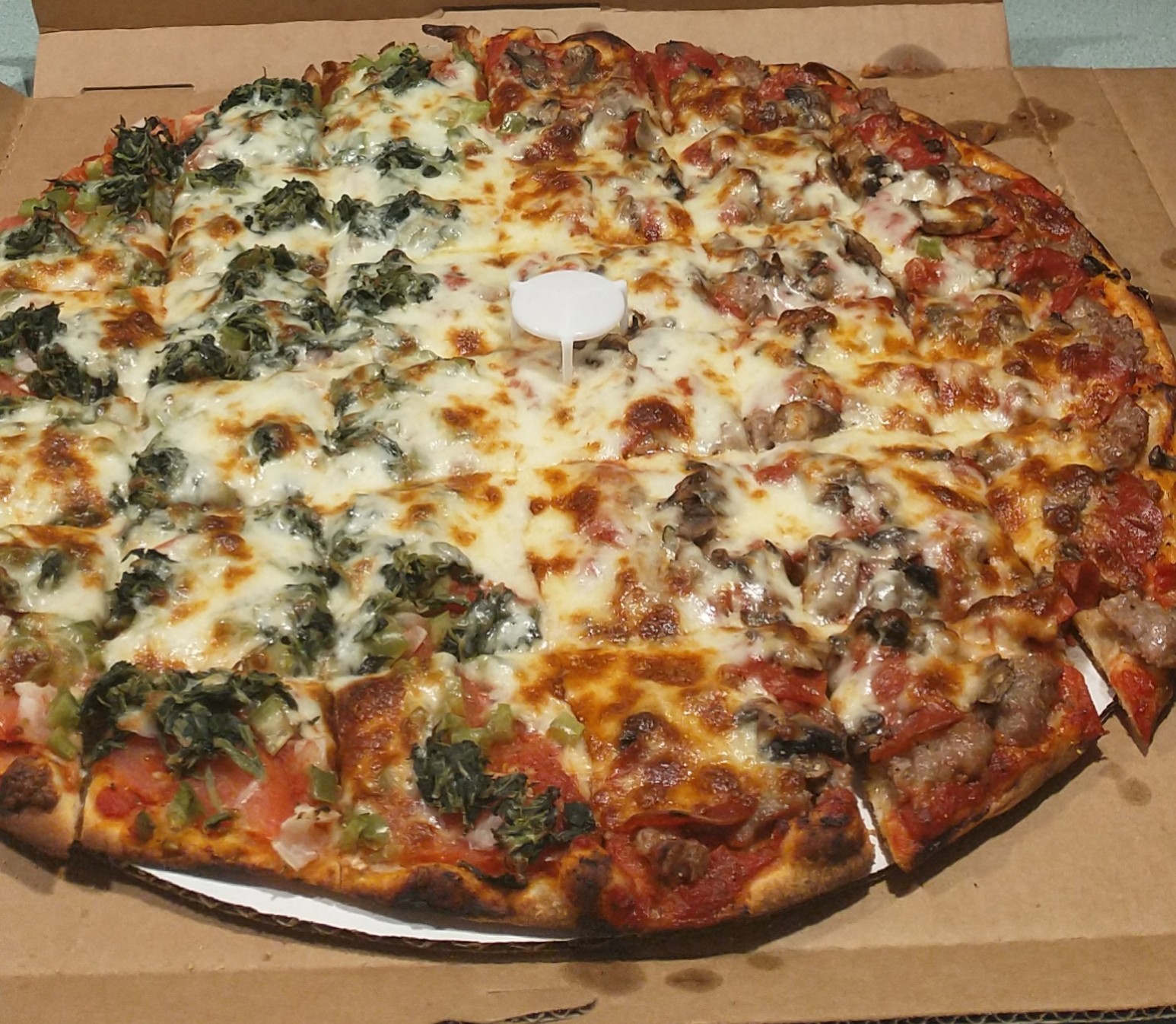 I ordered half pepperoni, sausage and mushroom per my 9 years old's request and the other half I just told her veggies which was spinach, tomato, onion and green pepper. Sooooo delicious! Price was reasonable and super yummy...