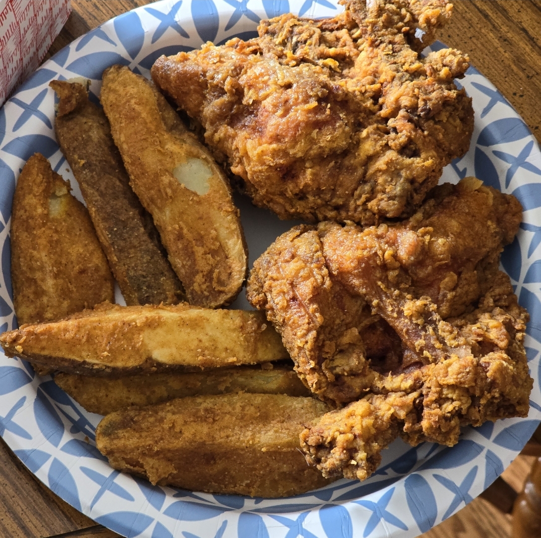 Their broasted (deep pressure fried) chicken is amazing. Golden fried, always very moist and usually generous sized pieces. The broasted potato wedges are giant slices of potato, battered and deep pressure fried. If you love fried potato, you're going to adore them. They are what a potato wedge should be, not these dinky little thick french fries people often call potato wedges. These feel like actual wedges of a complete potato.