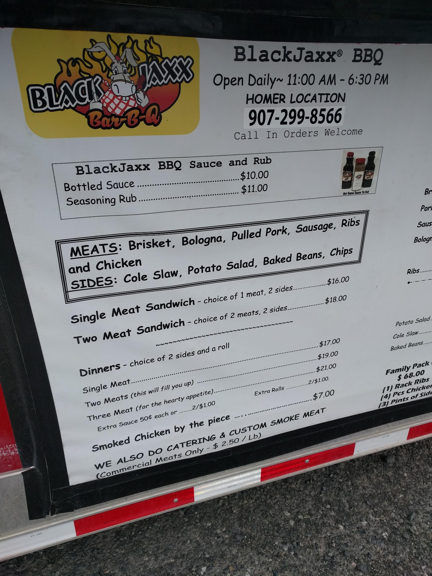 Read moreThis place is so good! Best value on the spit and great flavor. Big servings. I dont even like baked beans and yet i order a double portion here. And the ribs have a fantastic smoky flavor that needs no sauce. We always stop here on summer trips to Homer. In 2025 a new BBQ truck opened in town. I tried it for comparison. At each I bought a 3 meat plate. The 3 meat plate from the comptetion was good but was $4 more than here, with much smaller sizes than BlackJaxx. Blackjaxx is better flavor, and they allow ribs as part of the meat options. I ate the competitions entire plate and left still hungry. I've NEVER eaten a three meat plate from Blackjaxx in one sitting. You cannot go wrong...