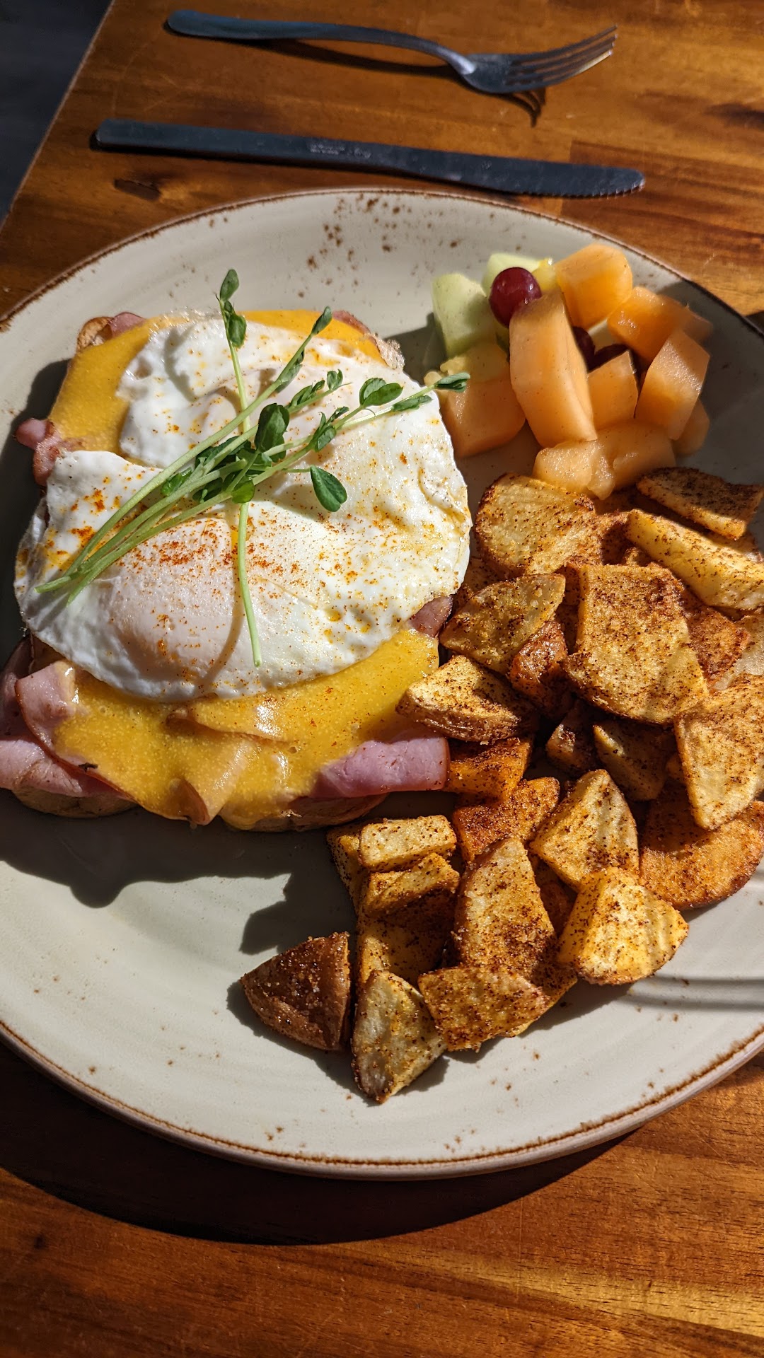 Otherwise this is the best value on the Spit. Smoked salmon benedict with greens and perfectly poached eggs, fruit and breakfast potatoes for $16. Oh and the coffee is complementary! There was also a daily special...open faced ham & egg breakfast sandwich which was superb.