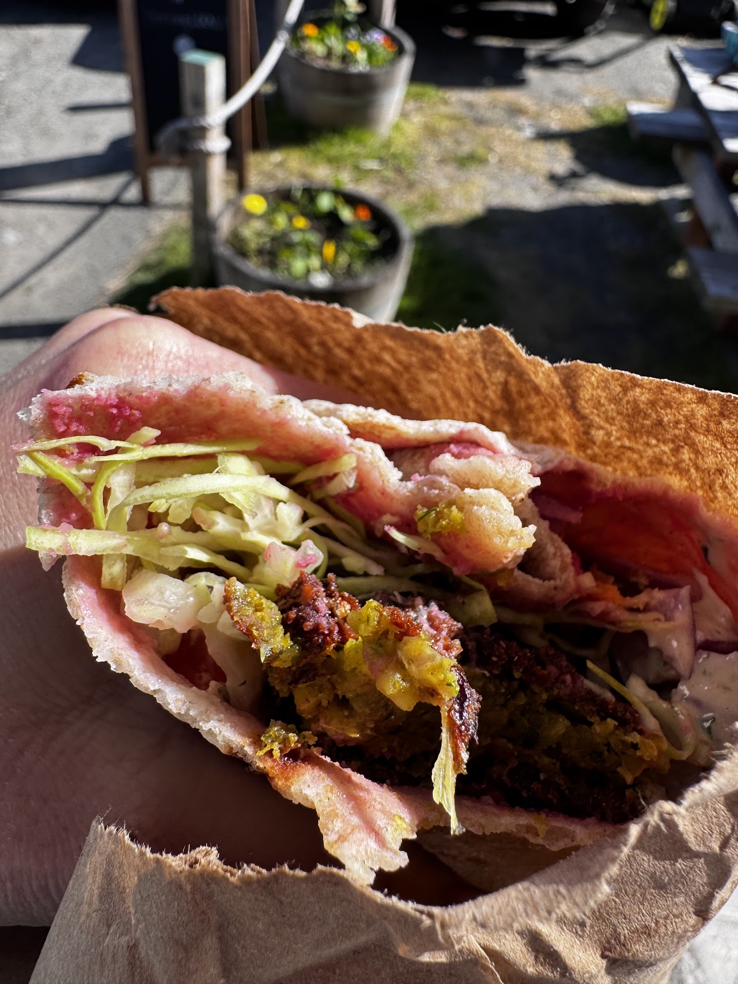 Read moreThis is a good truck with nowhere to sit and don't. They are located next to a cider house that makes you buy there too if you want to sit there to eat food. The cider was good but not offered by Shiva Boom. Parking is terrible, on a hill with no room to turn a bigger vehicle around. It's a dirt lot, so cooking into here on a rainy day is a nightmare. Food: not the usual Indian food you would expect. But their falafel is pretty good. Their chutney is not very good. Their portion size leaves much to be desired especially for the price. There are so many local options in Homer to gather food and resources that I feel like they could have done more locally sourced ingredients. Service: it's a food truck. They did not provide any cutlery, napkins, or drink options. Although drink options were offered by the cider/mead...