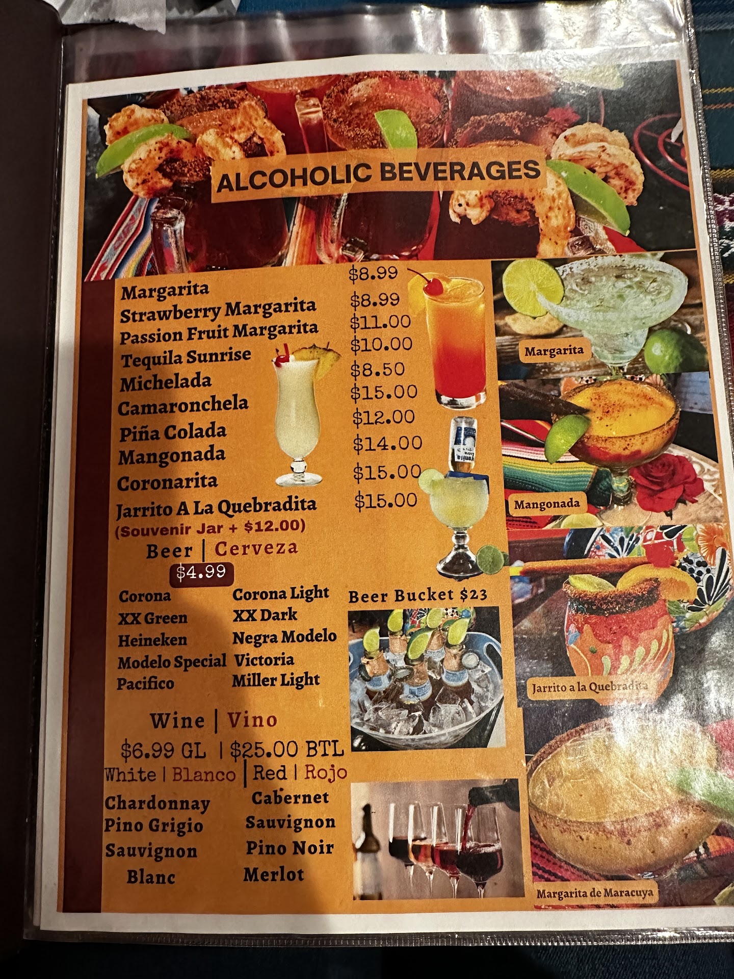 My $9.00 Margarita was nothing like our previous visit. It tasted terrible, like a bottled Margarita Mix (without any Tequila) that you can get at any local grocery store for less than $10.00.