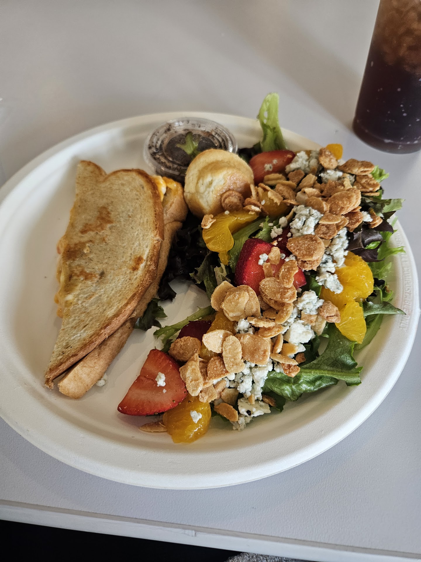 The food was okay. I was bummed to see they serve Red Diamond tea; it's not a favorite of mine at all, although I suppose it's local so it makes sense. The chicken was probably the best part, in the sense that it was actually cooked perfectly. Still tender and juicy! I didn't get much rosemary, though; the lemon and feta overwhelmed it and some bites were quite salty and/or acidic. The rice was also cooked well, not too mushy nor undercooked. The fruit cup was...fine. About one strawberry cut in halves, two apple pieces, a very small handful of grapes, and the rest of it oranges, which are not my favorite. Probably on me for ordering it, as I don't tend to think fruit cups are worth it when dining out, but I was trying to cater to my tummy. If I return, I'd get something different.