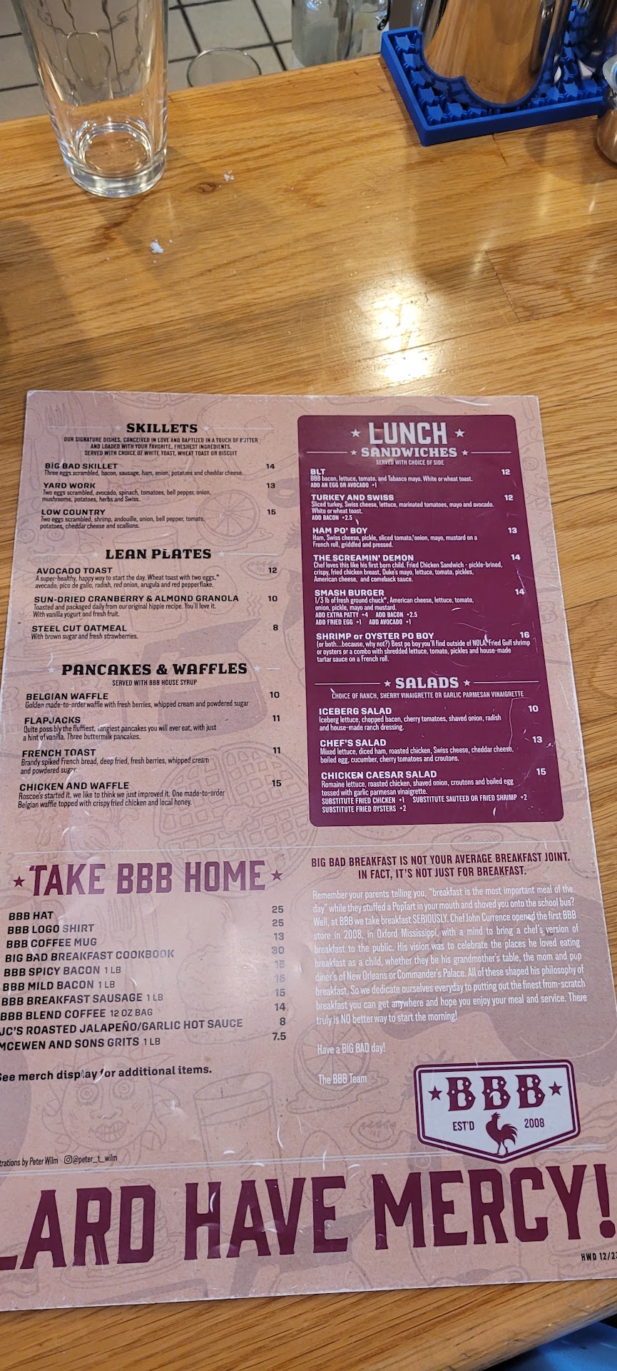 Read moreOf all the hard choices in life BBB makes breakfast a no-brainer. I have enjoyed this restaurant for years. Then came the Homewood location.... Rajean ( the French Reggie😂) is very nice and never intruded on my rare excursions out alone to enjoy my favorite meal. Then Autumn came... No not the season. The server. Autumn is always cheerful, knowledgeable, while still remembering the orders of her regulars. Hell the whole staff acts like that. As Autumn was working feverishly doing her job she is telling how much she loves...her Manager!!! What?!? Who loves their boss.... Come to find out, this “taskmaster” Will was working behind her taking plates to tables. All the while smiling.....he was very pleasant too. What’s in the water there, because we all need that kind of happiness at work. Skip Ruby Sunshine and their Bowls of alcohol... the reason why they serve in such big glasses is because you WON’T see your bartender/server for the next hour. Not at big bad breakfast!!! 110% best atmosphere/ food around!!! Price makes you as happy as the...