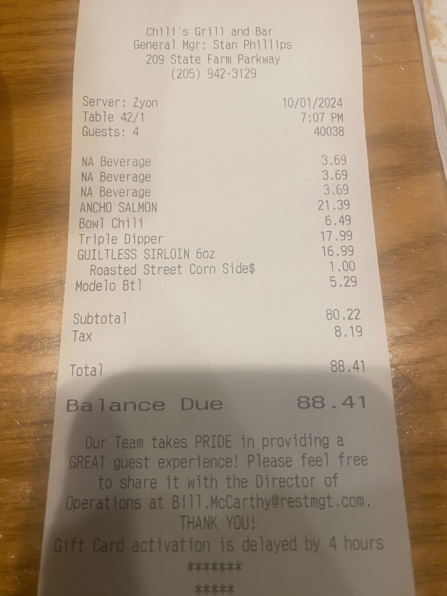 We saw two other tables leave. They gave up on getting service, as there servers never visited their tables. One was in our section, the other in the section next to us. I’m pointing this out, as it wasn’t just one server not handling business. Another table got up and found their own napkins and flatware.