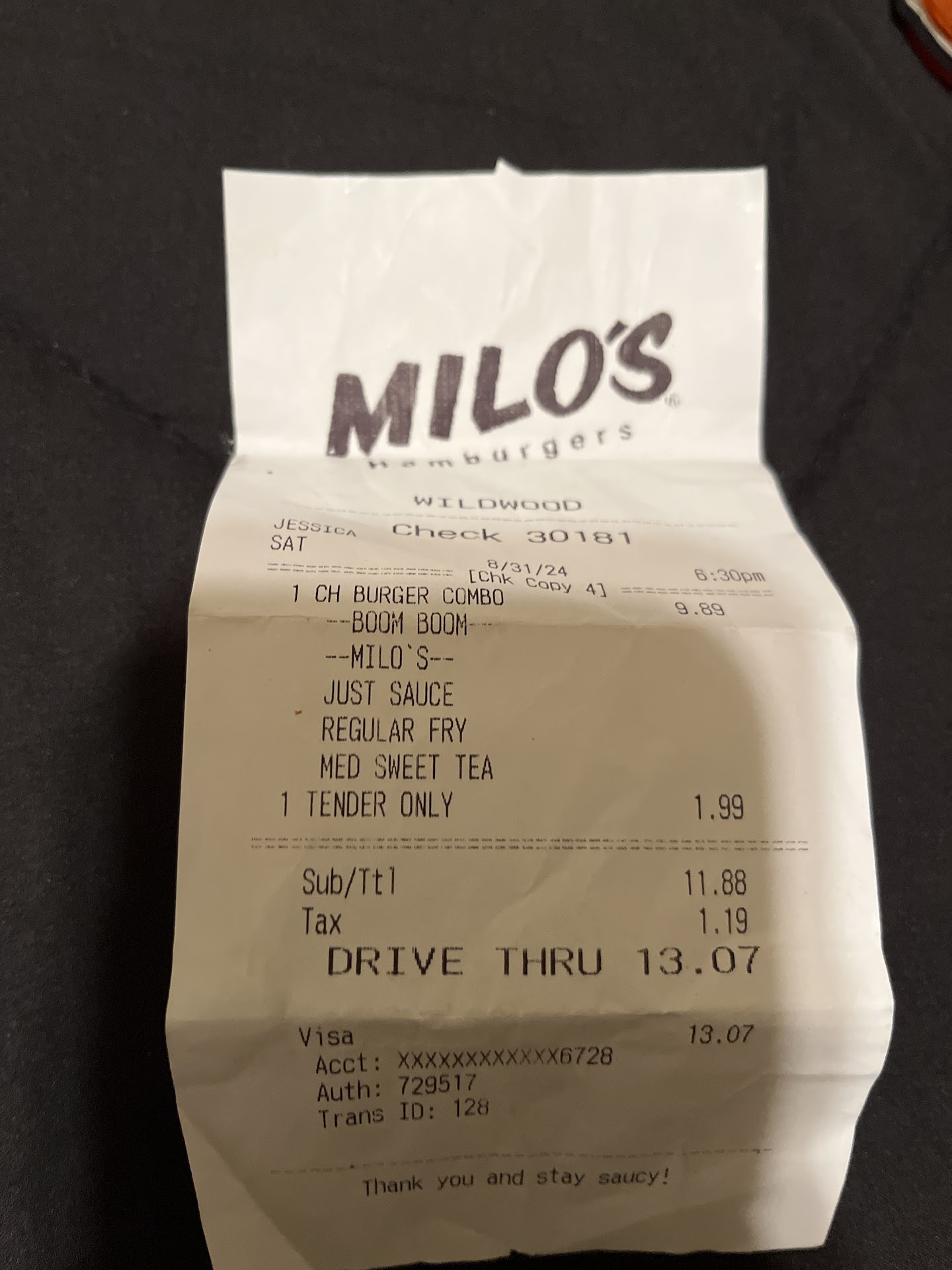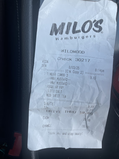06/30/2024, the Milo's Hamburgers, Wildwood, always has extremely good service, and the employees are is so very pleasant and professional. They remember us and make a us feel welcome. We ordered the Mega Meal, fries, and chicken tenders. We had the original Milo's sauce, and the original Milo's tea. We also ordered Milo's double cheeseburgers to go. Whenever we go to Milo's, we are thanked for being customers, and welcomed us back. Milo's is NOT like any other restaurant today. The food is amazing, and so is the service. Tinasha took our orders, and she was very nice. God bless! Mark...